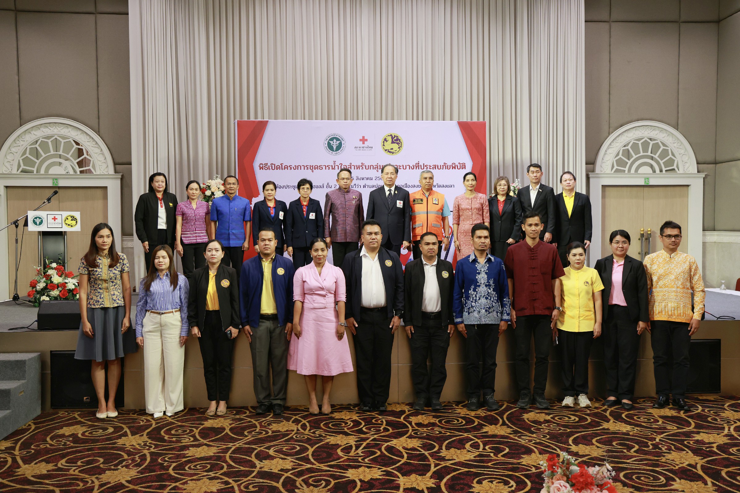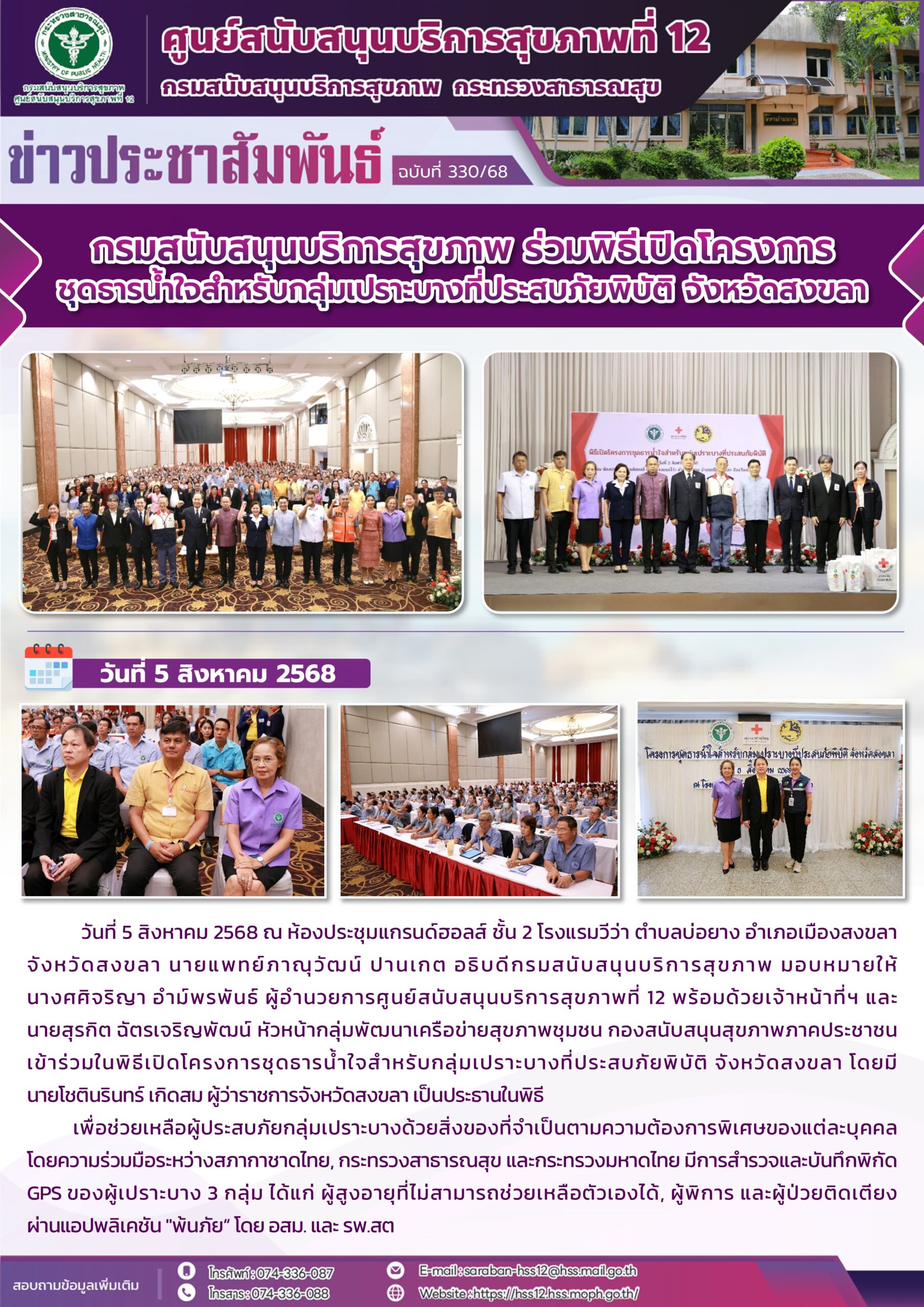 วันที่ 5 สิงหาคม 2568 ณ ห้องประชุมแกรนด์ฮอลส์ ชั้น 2 โรงแรมวีว่า ตำบลบ่อยาง อำเภอเมืองสงขลา จังหวัดสงขลา นายแพทย์ภาณุวัฒน์ ปานเกต อธิบดีกรมสนับสนุนบริการสุขภาพ มอบหมายให้ นางศศิจริญา อำม์พรพันธ์ ผู้อำนวยการศูนย์สนับสนุนบริการสุขภาพที่ 12 พร้อมด้วยเจ้าหน้าที่ฯ และ นายสุรกิต ฉัตรเจริญพัฒน์ หัวหน้ากลุ่มพัฒนาเครือข่ายสุขภาพชุมชน กองสนับสนุนสุขภาพภาคประชาชน เข้าร่วมในพิธีเปิดโครงการชุดธารน้ำใจสำหรับกลุ่มเปราะบางที่ประสบภัยพิบัติ จังหวัดสงขลา โดยมี นายโชตินรินทร์ เกิดสม ผู้ว่าราชการจังหวัดสงขลา เป็นประธานในพิธี