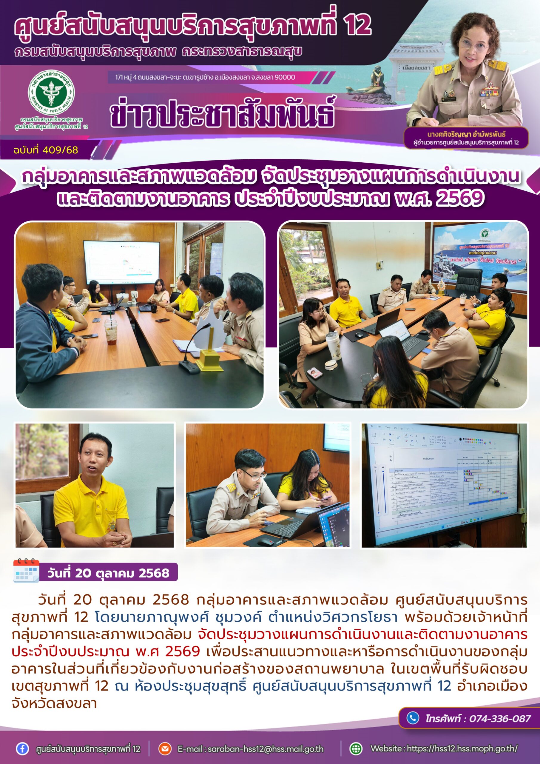 วันที่ 20 ตุลาคม 2568 กลุ่มอาคารและสภาพแวดล้อม ศูนย์สนับสนุนบริการสุขภาพที่ 12 โดยนายภาณุพงศ์ ชุมวงค์ ตำแหน่งวิศวกรโยธา พร้อมด้วยเจ้าหน้าที่กลุ่มอาคารและสภาพแวดล้อม จัดประชุมวางแผนการดำเนินงานและติดตามงานอาคาร ประจำปีงบประมาณ พ.ศ 2569 เพื่อประสานแนวทางและหารือการดำเนินงานของกลุ่มอาคารในส่วนที่เกี่ยวข้องกับงานก่อสร้างของสถานพยาบาล ในเขตพื้นที่รับผิดชอบ เขตสุขภาพที่ 12 ณ ห้องประชุมสุขสุทธิ์ ศูนย์สนับสนุนบริการสุขภาพที่ 12 อำเภอเมือง จังหวัดสงขลา