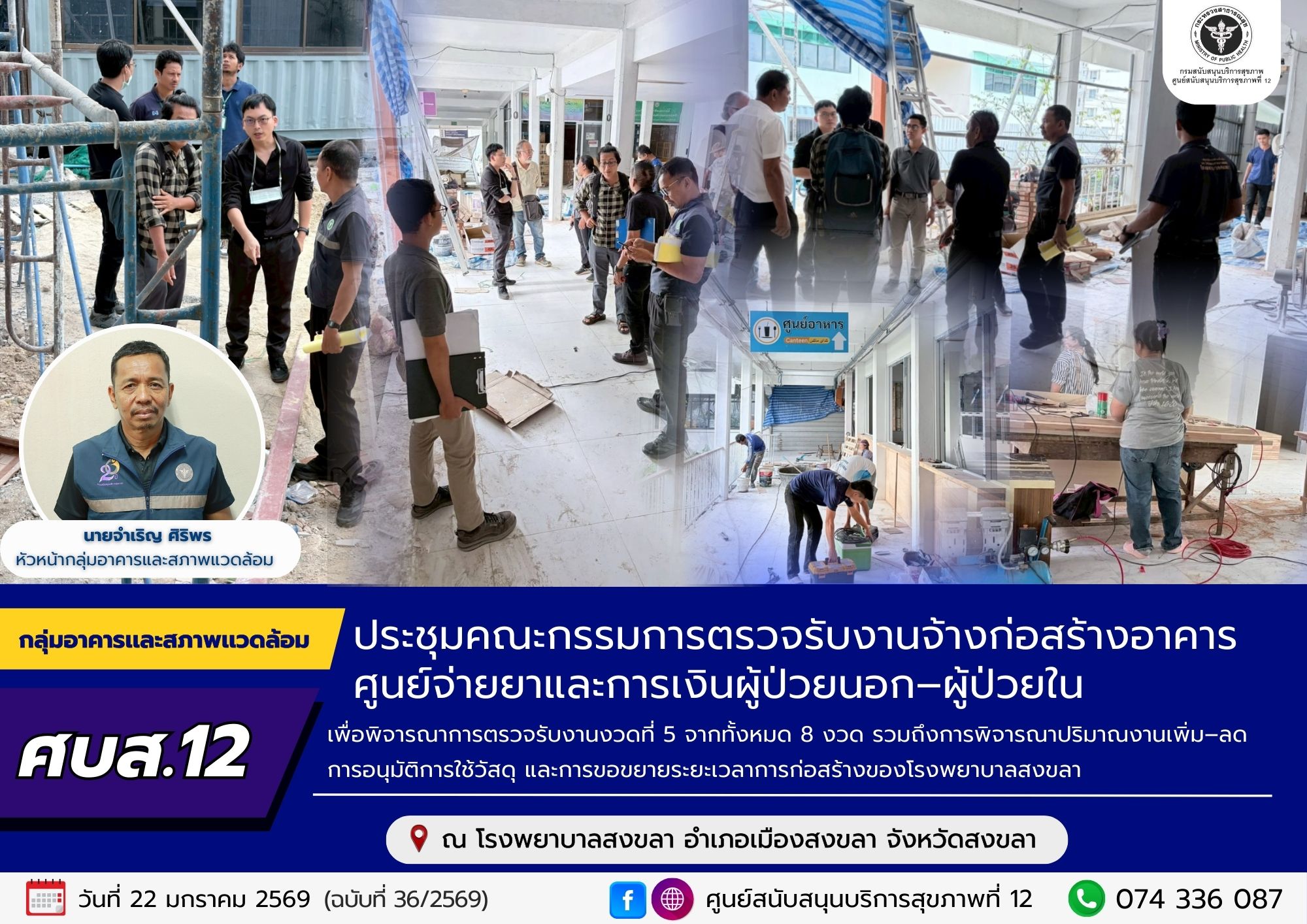 วันที่ 22 มกราคม 2569 นายจำเริญ ศิริพร หัวหน้ากลุ่มอาคารและสภาพแวดล้อม ได้รับมอบหมายจากผู้อำนวยการศูนย์สนับสนุนบริการสุขภาพที่ 12 เข้าร่วมประชุมคณะกรรมการตรวจรับงานจ้างก่อสร้างอาคารศูนย์จ่ายยาและการเงินผู้ป่วยนอก–ผู้ป่วยใน ของโรงพยาบาลสงขลา เพื่อพิจารณาการตรวจรับงานงวดที่ 5 จากทั้งหมด 8 งวด รวมถึงการพิจารณาปริมาณงานเพิ่ม–ลด การอนุมัติการใช้วัสดุ และการขอขยายระยะเวลาการก่อสร้างของโรงพยาบาลสงขลา