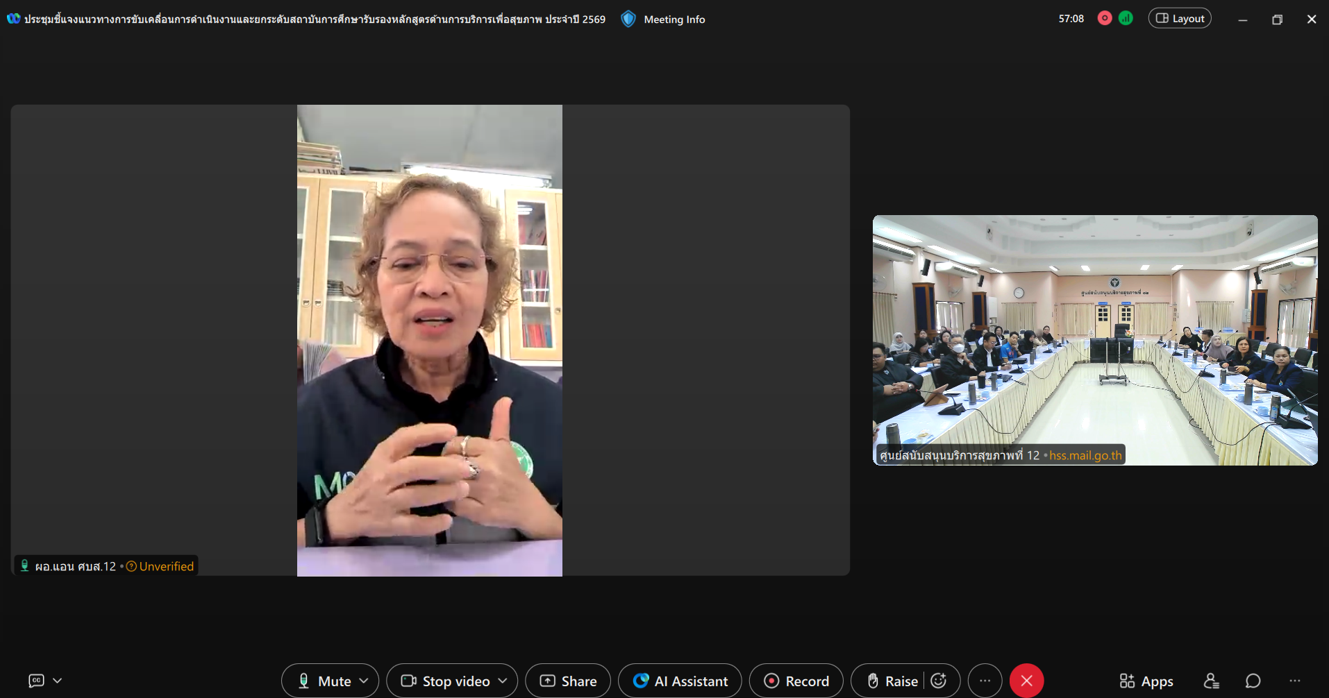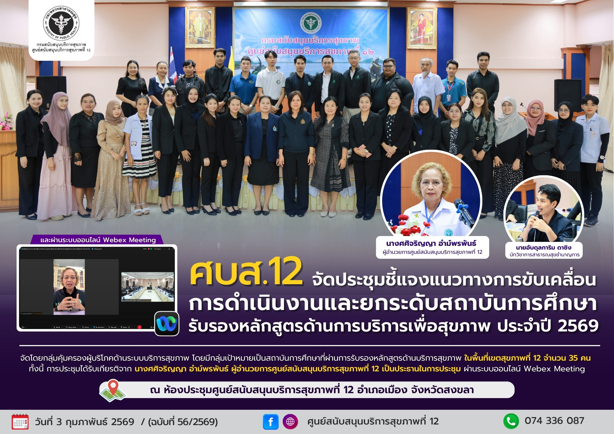 วันที่ 3 กุมภาพันธ์ 2569 นางศศิจริญญา อำม์พรพันธ์ ผู้อำนวยการศูนย์สนับสนุนบริการสุขภาพที่ 12 มอบหมายให้กลุ่มคุ้มครองผู้บริโภคด้านระบบบริการสุขภาพ จัดประชุมชี้แจงแนวทางการขับเคลื่อนการดำเนินงานและยกระดับสถาบันการศึกษาที่ผ่านการรับรองหลักสูตรด้านการบริการเพื่อสุขภาพ ประจำปีงบประมาณ พ.ศ. 2569