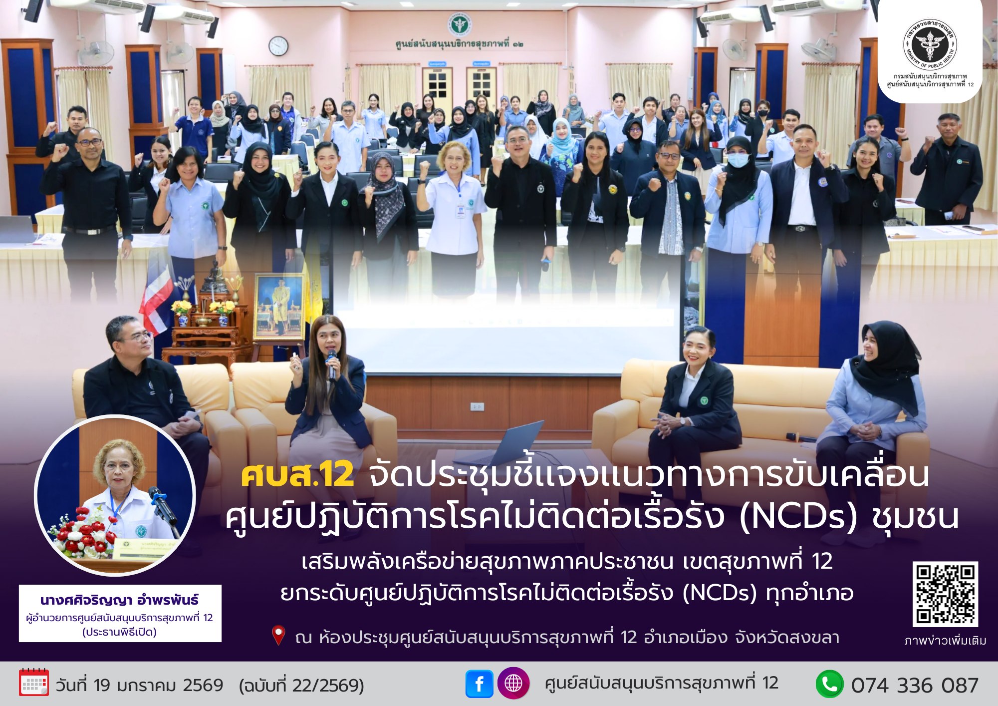 วันที่ 19 มกราคม 2569 ศูนย์สนับสนุนบริการสุขภาพที่ 12 โดยกลุ่มสุขศึกษาและสุขภาพภาคประชาชน จัดการประชุมเชิงปฏิบัติการชี้แจงแนวทางการขับเคลื่อนศูนย์ปฏิบัติการโรคไม่ติดต่อเรื้อรัง (NCDs) หมู่บ้าน “โครงการวิจัยการพัฒนารูปแบบศูนย์ปฏิบัติการโรคไม่ติดต่อเรื้อรังชุมชน ประจำปีงบประมาณ พ.ศ. 2569” พร้อมบูรณาการการชี้แจงแนวทางการขับเคลื่อนนโยบายสุขภาพภาคประชาชน เขตสุขภาพที่ 12