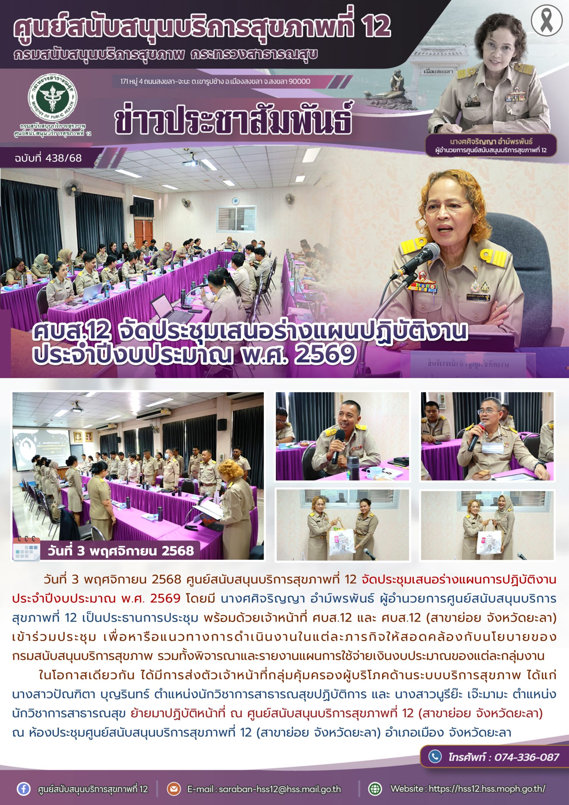 วันที่ 3 พฤศจิกายน 2568 ศูนย์สนับสนุนบริการสุขภาพที่ 12 จัดประชุมเสนอร่างแผนการปฏิบัติงานประจำปีงบประมาณ พ.ศ. 2569 โดยมี นางศศิจริญญา อำม์พรพันธ์ ผู้อำนวยการศูนย์สนับสนุนบริการสุขภาพที่ 12 เป็นประธานการประชุม พร้อมด้วยเจ้าหน้าที่ ศบส.12 และ ศบส.12 (สาขาย่อย จังหวัดยะลา) เข้าร่วมประชุม เพื่อหารือแนวทางการดำเนินงานในแต่ละภารกิจให้สอดคล้องกับนโยบายของกรมสนับสนุนบริการสุขภาพ รวมทั้งพิจารณาและรายงานแผนการใช้จ่ายเงินงบประมาณของแต่ละกลุ่มงาน