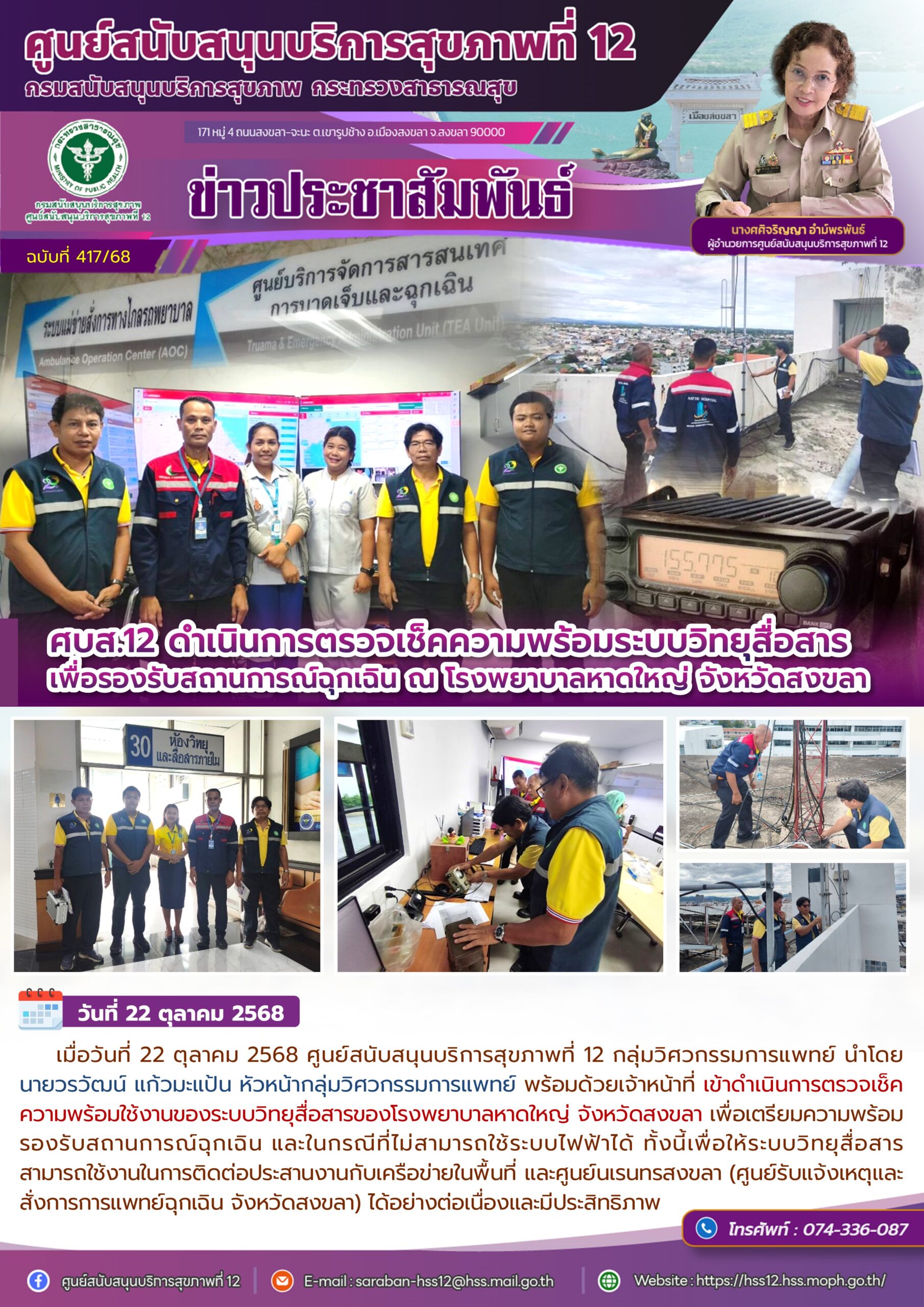 เมื่อวันที่ 22 ตุลาคม 2568 ศูนย์สนับสนุนบริการสุขภาพที่ 12 กลุ่มวิศวกรรมการแพทย์ นำโดย นายวรวัฒน์ แก้วมะแป้น หัวหน้ากลุ่มวิศวกรรมการแพทย์ พร้อมด้วยเจ้าหน้าที่ เข้าดำเนินการตรวจเช็คความพร้อมใช้งานของระบบวิทยุสื่อสารของโรงพยาบาลหาดใหญ่ จังหวัดสงขลา เพื่อเตรียมความพร้อมรองรับสถานการณ์ฉุกเฉิน และในกรณีที่ไม่สามารถใช้ระบบไฟฟ้าได้ ทั้งนี้เพื่อให้ระบบวิทยุสื่อสารสามารถใช้งานในการติดต่อประสานงานกับเครือข่ายในพื้นที่ และศูนย์นเรนทรสงขลา (ศูนย์รับแจ้งเหตุและสั่งการการแพทย์ฉุกเฉิน จังหวัดสงขลา) ได้อย่างต่อเนื่องและมีประสิทธิภาพ