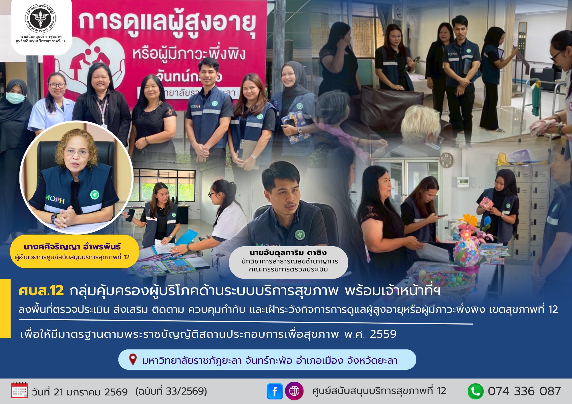 เมื่อวันที่ 22 มกราคม 2569 ศูนย์สนับสนุนบริการสุขภาพที่ 12 โดยกลุ่มคุ้มครองผู้บริโภคด้านระบบบริการสุขภาพ นำโดยนายอับดุลการิม ดาซิง นักวิชาการสาธารณสุขชำนาญการ พร้อมด้วยเจ้าหน้าที่ฯ ได้ลงพื้นที่ตรวจประเมิน ส่งเสริม ติดตาม ควบคุมกำกับ และเฝ้าระวังกิจการการดูแลผู้สูงอายุหรือผู้มีภาวะพึ่งพิง ในเขตสุขภาพที่ 12 จำนวน 1 แห่ง