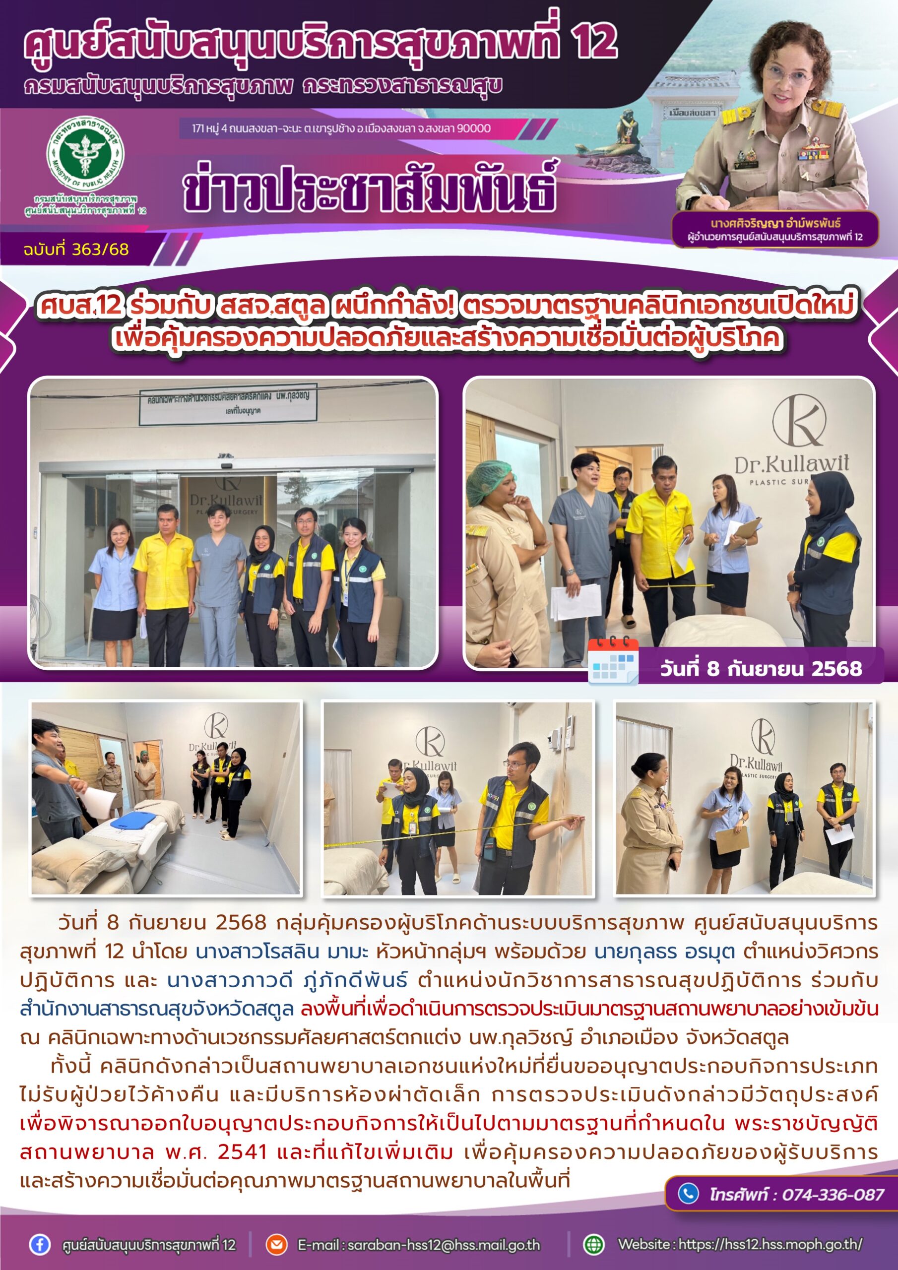 ศบส.12 ร่วมกับ สสจ.สตูล ผนึกกำลัง! ตรวจมาตรฐานคลินิกเอกชนเปิดใหม่ เพื่อคุ้มครองความปลอดภัยและสร้างความเชื่อมั่นต่อผู้บริโภค
