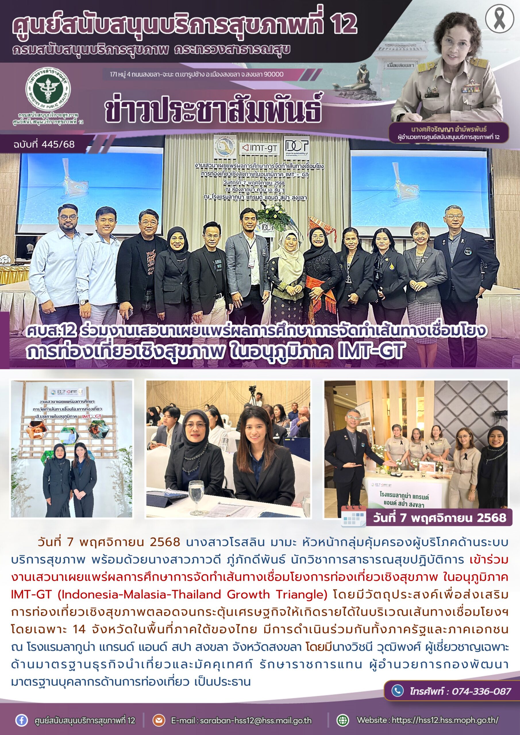 ศบส.12 ร่วมงานเสวนาเผยแพร่ผลการศึกษาการจัดทำเส้นทางเชื่อมโยงการท่องเที่ยวเชิงสุขภาพ ในอนุภูมิภาค IMT-GT
