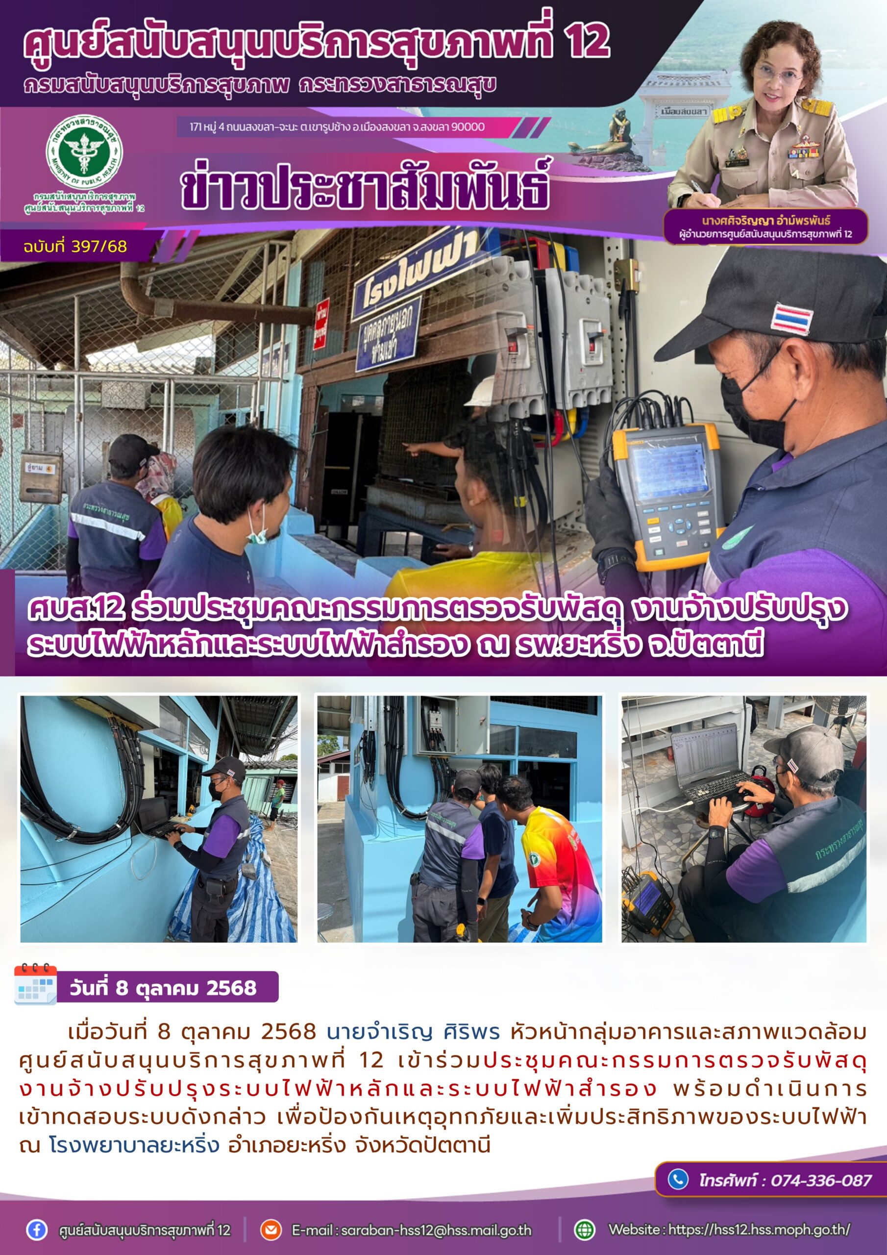 เมื่อวันที่ 8 ตุลาคม 2568 นายจำเริญ ศิริพร หัวหน้ากลุ่มอาคารและสภาพแวดล้อม ศูนย์สนับสนุนบริการสุขภาพที่ 12 เข้าร่วมประชุมคณะกรรมการตรวจรับพัสดุ งานจ้างปรับปรุงระบบไฟฟ้าหลักและระบบไฟฟ้าสำรอง พร้อมดำเนินการเข้าทดสอบระบบดังกล่าว เพื่อป้องกันเหตุอุทกภัยและเพิ่มประสิทธิภาพของระบบไฟฟ้า ณ โรงพยาบาลยะหริ่ง อำเภอยะหริ่ง จังหวัดปัตตานี