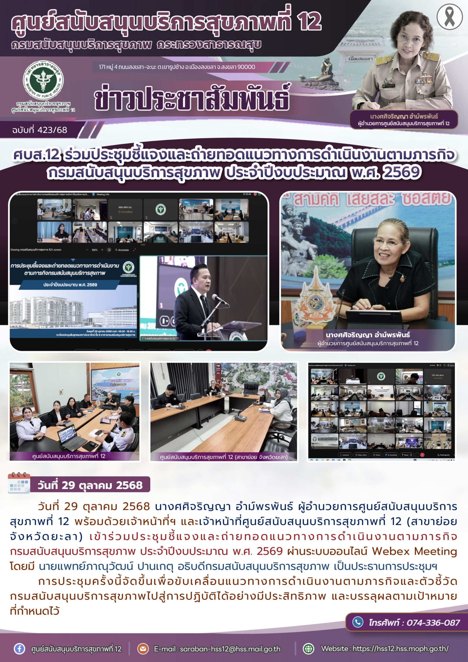 วันที่ 29 ตุลาคม 2568 นางศศิจริญญา อำม์พรพันธ์ ผู้อำนวยการศูนย์สนับสนุนบริการสุขภาพที่ 12 พร้อมด้วยเจ้าหน้าที่ฯ และเจ้าหน้าที่ศูนย์สนับสนุนบริการสุขภาพที่ 12 (สาขาย่อย จังหวัดยะลา) เข้าร่วมประชุมชี้แจงและถ่ายทอดแนวทางการดำเนินงานตามภารกิจกรมสนับสนุนบริการสุขภาพ ประจำปีงบประมาณ พ.ศ. 2569 ผ่านระบบออนไลน์ Webex Meeting โดยมี นายแพทย์ภาณุวัฒน์ ปานเกตุ อธิบดีกรมสนับสนุนบริการสุขภาพ เป็นประธานการประชุมฯ
