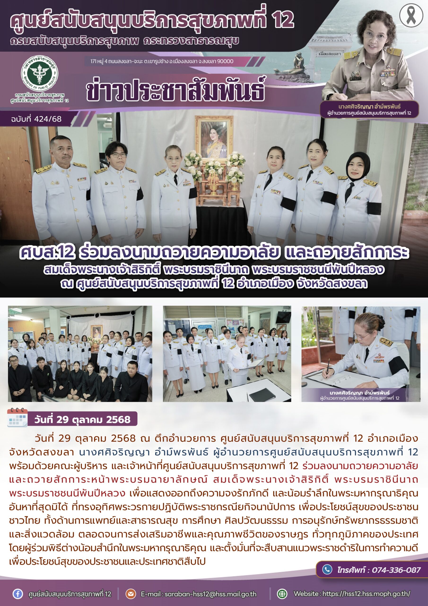 วันที่ 29 ตุลาคม 2568 ณ ตึกอำนวยการ ศูนย์สนับสนุนบริการสุขภาพที่ 12 อำเภอเมือง จังหวัดสงขลา นางศศิจริญญา อำม์พรพันธ์ ผู้อำนวยการศูนย์สนับสนุนบริการสุขภาพที่ 12 พร้อมด้วยคณะผู้บริหาร และเจ้าหน้าที่ศูนย์สนับสนุนบริการสุขภาพที่ 12 ร่วมลงนามถวายความอาลัย และถวายสักการะหน้าพระบรมฉายาลักษณ์ สมเด็จพระนางเจ้าสิริกิติ์ พระบรมราชินีนาถ พระบรมราชชนนีพันปีหลวง เพื่อแสดงออกถึงความจงรักภักดี และน้อมรำลึกในพระมหากรุณาธิคุณ อันหาที่สุดมิได้ ที่ทรงอุทิศพระวรกายปฏิบัติพระราชกรณียกิจนานัปการ เพื่อประโยชน์สุขของประชาชนชาวไทย ทั้งด้านการแพทย์และสาธารณสุข การศึกษา ศิลปวัฒนธรรม การอนุรักษ์ทรัพยากรธรรมชาติ และสิ่งแวดล้อม ตลอดจนการส่งเสริมอาชีพและคุณภาพชีวิตของราษฎร ทั่วทุกภูมิภาคของประเทศ โดยผู้ร่วมพิธีต่างน้อมสำนึกในพระมหากรุณาธิคุณ และตั้งมั่นที่จะสืบสานแนวพระราชดำริในการทำความดี เพื่อประโยชน์สุขของประชาชนและประเทศชาติสืบไป