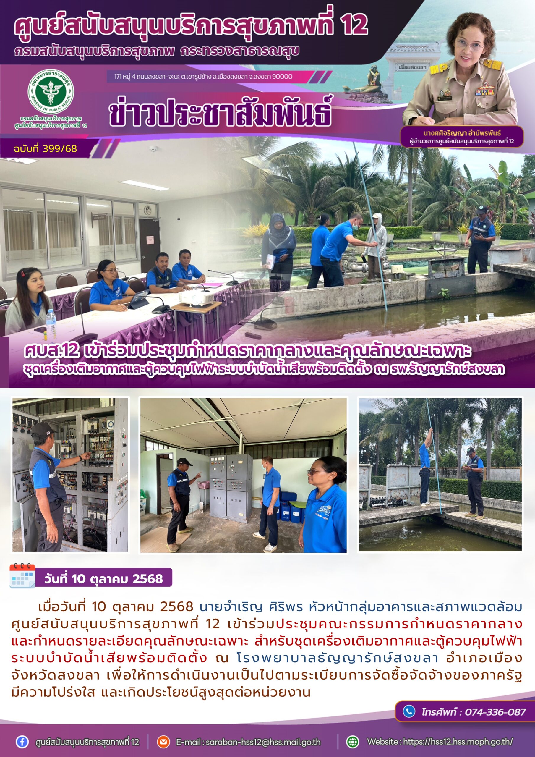 เมื่อวันที่ 10 ตุลาคม 2568 นายจำเริญ ศิริพร หัวหน้ากลุ่มอาคารและสภาพแวดล้อม ศูนย์สนับสนุนบริการสุขภาพที่ 12 เข้าร่วมประชุมคณะกรรมการกำหนดราคากลางและกำหนดรายละเอียดคุณลักษณะเฉพาะ สำหรับชุดเครื่องเติมอากาศและตู้ควบคุมไฟฟ้าระบบบำบัดน้ำเสียพร้อมติดตั้ง ณ โรงพยาบาลธัญญารักษ์สงขลา อำเภอเมือง จังหวัดสงขลา เพื่อให้การดำเนินงานเป็นไปตามระเบียบการจัดซื้อจัดจ้างของภาครัฐ มีความโปร่งใส และเกิดประโยชน์สูงสุดต่อหน่วยงาน