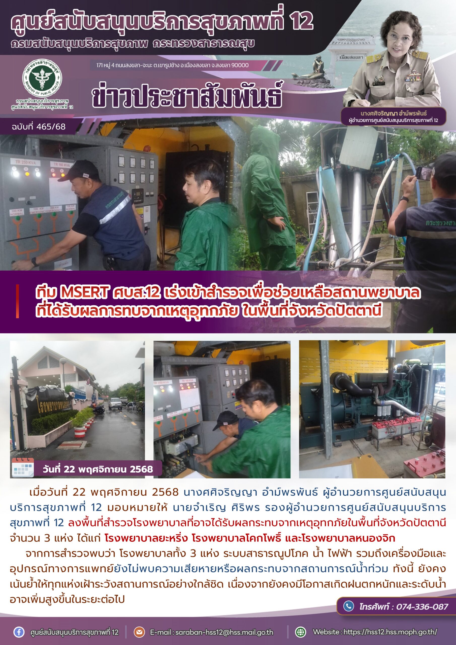 เมื่อวันที่ 22 พฤศจิกายน 2568 นางศศิจริญญา อำม์พรพันธ์ ผู้อำนวยการศูนย์สนับสนุนบริการสุขภาพที่ 12 มอบหมายให้ นายจำเริญ ศิริพร รองผู้อำนวยการศูนย์สนับสนุนบริการสุขภาพที่ 12 ลงพื้นที่สำรวจโรงพยาบาลที่อาจได้รับผลกระทบจากเหตุอุทกภัยในพื้นที่จังหวัดปัตตานี จำนวน 3 แห่ง ได้แก่ โรงพยาบาลยะหริ่ง โรงพยาบาลโคกโพธิ์ และโรงพยาบาลหนองจิก
