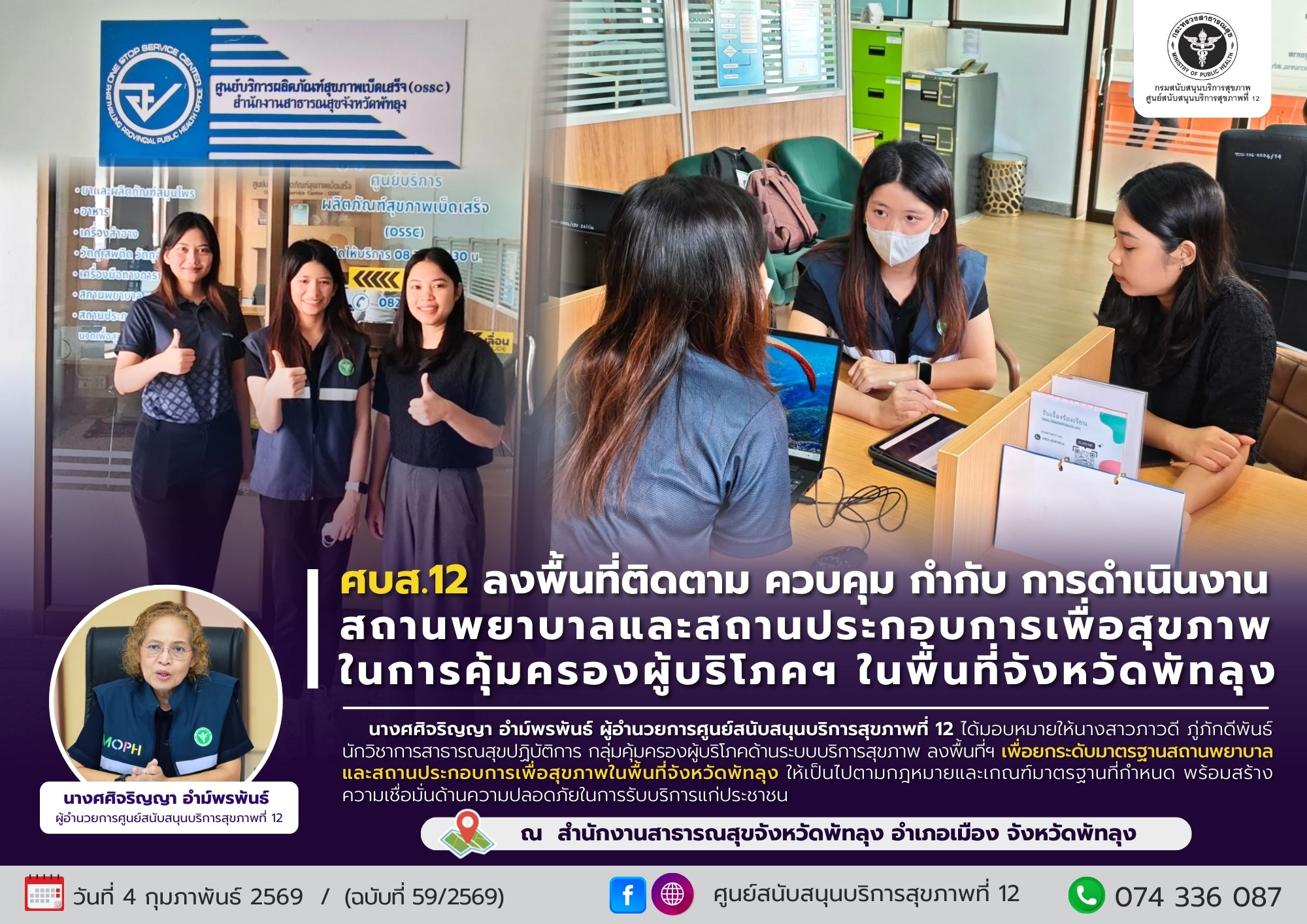 วันที่ 4 กุมภาพันธ์ 2569 นางศศิจริญญา อำม์พรพันธ์ ผู้อำนวยการศูนย์สนับสนุนบริการสุขภาพที่ 12 ได้มอบหมายให้นางสาวภาวดี ภู่ภักดีพันธ์ นักวิชาการสาธารณสุขปฏิบัติการ กลุ่มคุ้มครองผู้บริโภคด้านระบบบริการสุขภาพ ลงพื้นที่ติดตาม ควบคุม กำกับ การดำเนินงานสถานพยาบาลและสถานประกอบการเพื่อสุขภาพ ในการคุ้มครองผู้บริโภคฯ ตามตัวชี้วัด ร้อยละสถานพยาบาลและสถานประกอบการเพื่อสุขภาพกลุ่มเป้าหมายผ่านเกณฑ์มาตรฐานตามที่กำหนด เพื่อยกระดับมาตรฐานสถานพยาบาลและสถานประกอบการเพื่อสุขภาพในพื้นที่จังหวัดพัทลุง ให้เป็นไปตามกฎหมายและเกณฑ์มาตรฐานที่กำหนด พร้อมสร้างความเชื่อมั่นด้านความปลอดภัยในการรับบริการแก่ประชาชน ณ สำนักงานสาธารณสุขจังหวัดพัทลุง
