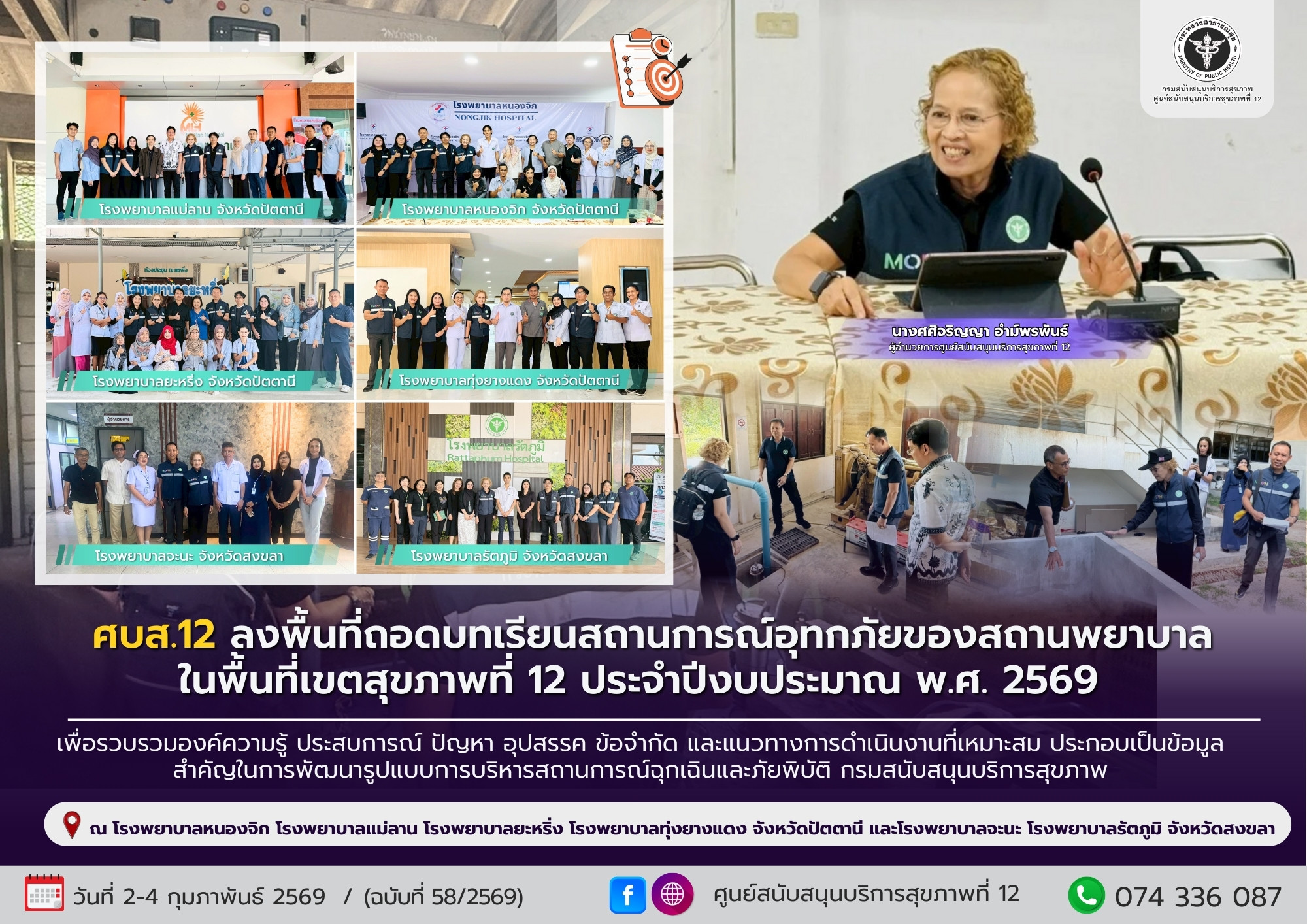 ระหว่างวันที่ 2–4 กุมภาพันธ์ 2569 นางศศิจริญญา อำม์พรพันธ์ ผู้อำนวยการศูนย์สนับสนุนบริการสุขภาพที่ 12 พร้อมด้วยนายวรวัฒน์ แก้วมะแป้น รองผู้อำนวยการศูนย์สนับสนุนบริการสุขภาพที่ 12 และเจ้าหน้าที่ศูนย์สนับสนุนบริการสุขภาพที่ 12 ลงพื้นที่ถอดบทเรียนสถานการณ์อุทกภัยของสถานพยาบาลในพื้นที่เขตสุขภาพที่ 12 ประจำปีงบประมาณ พ.ศ. 2569