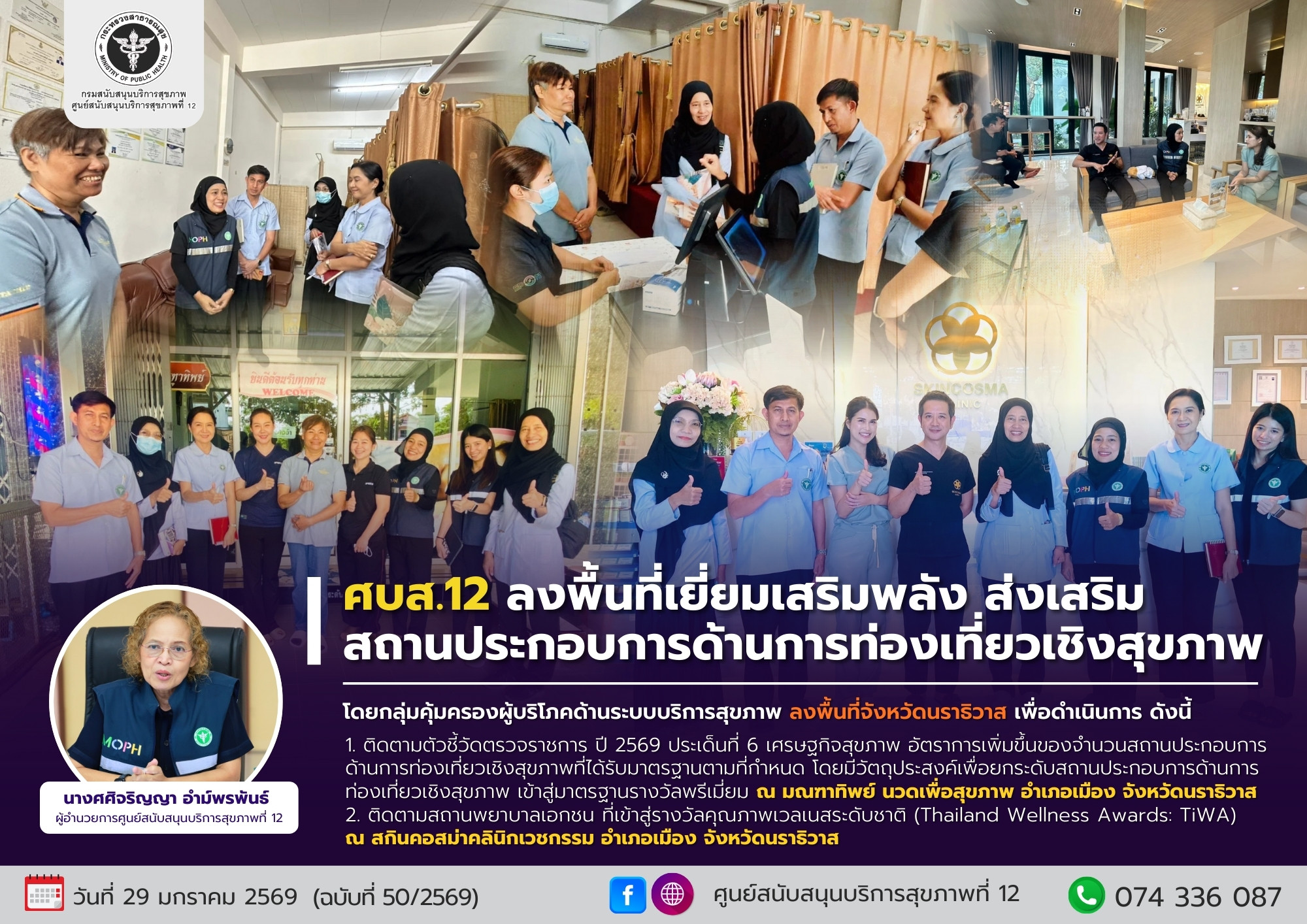 1. ติดตามตัวชี้วัดตรวจราชการ ปี 2569 ประเด็นที่ 6 เศรษฐกิจสุขภาพ อัตราการเพิ่มขึ้นของจำนวนสถานประกอบการด้านการท่องเที่ยวเชิงสุขภาพที่ได้รับมาตรฐานตามที่กำหนด โดยมีวัตถุประสงค์เพื่อยกระดับสถานประกอบการด้านการท่องเที่ยวเชิงสุขภาพ เข้าสู่มาตรฐานรางวัลพรีเมี่ยม ณ มณฑาทิพย์ นวดเพื่อสุขภาพ อำเภอเมือง จังหวัดนราธิวาส