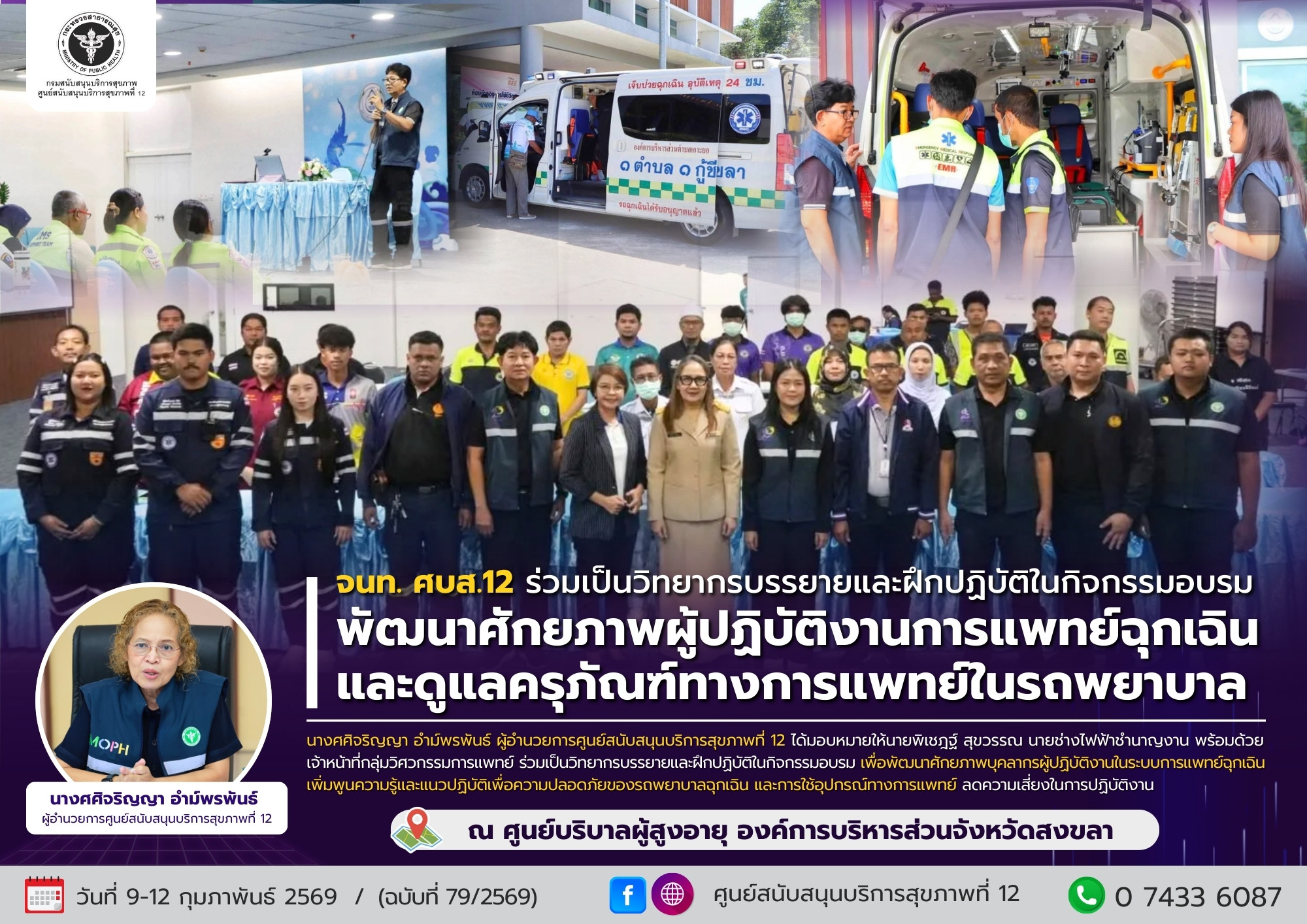 ระหว่างวันที่ 9-12 กุมภาพันธ์ 2569 นางศศิจริญญา อำม์พรพันธ์ ผู้อำนวยการศูนย์สนับสนุนบริการสุขภาพที่ 12 มอบหมายให้กลุ่มวิศวกรรมการแพทย์ นำโดยนายพิเชฎฐ์ สุขวรรณ นายช่างไฟฟ้าชำนาญงาน พร้อมด้วยเจ้าหน้าที่กลุ่มวิศวกรรมการแพทย์ ร่วมเป็นวิทยากรบรรยายและฝึกปฏิบัติในกิจกรรมอบรมพัฒนาศักยภาพผู้ปฏิบัติงานการแพทย์ฉุกเฉินและดูแลครุภัณฑ์ทางการแพทย์ในรถพยาบาล เพื่อพัฒนาศักยภาพบุคลากรผู้ปฏิบัติงานในระบบการแพทย์ฉุกเฉิน เพิ่มพูนความรู้และแนวปฏิบัติเพื่อความปลอดภัยของรถพยาบาลฉุกเฉิน และการใช้อุปกรณ์ทางการแพทย์ ลดความเสี่ยงในการปฏิบัติงาน ณ ศูนย์บริบาลผู้สูงอายุ องค์การบริหารส่วนจังหวัดสงขลา