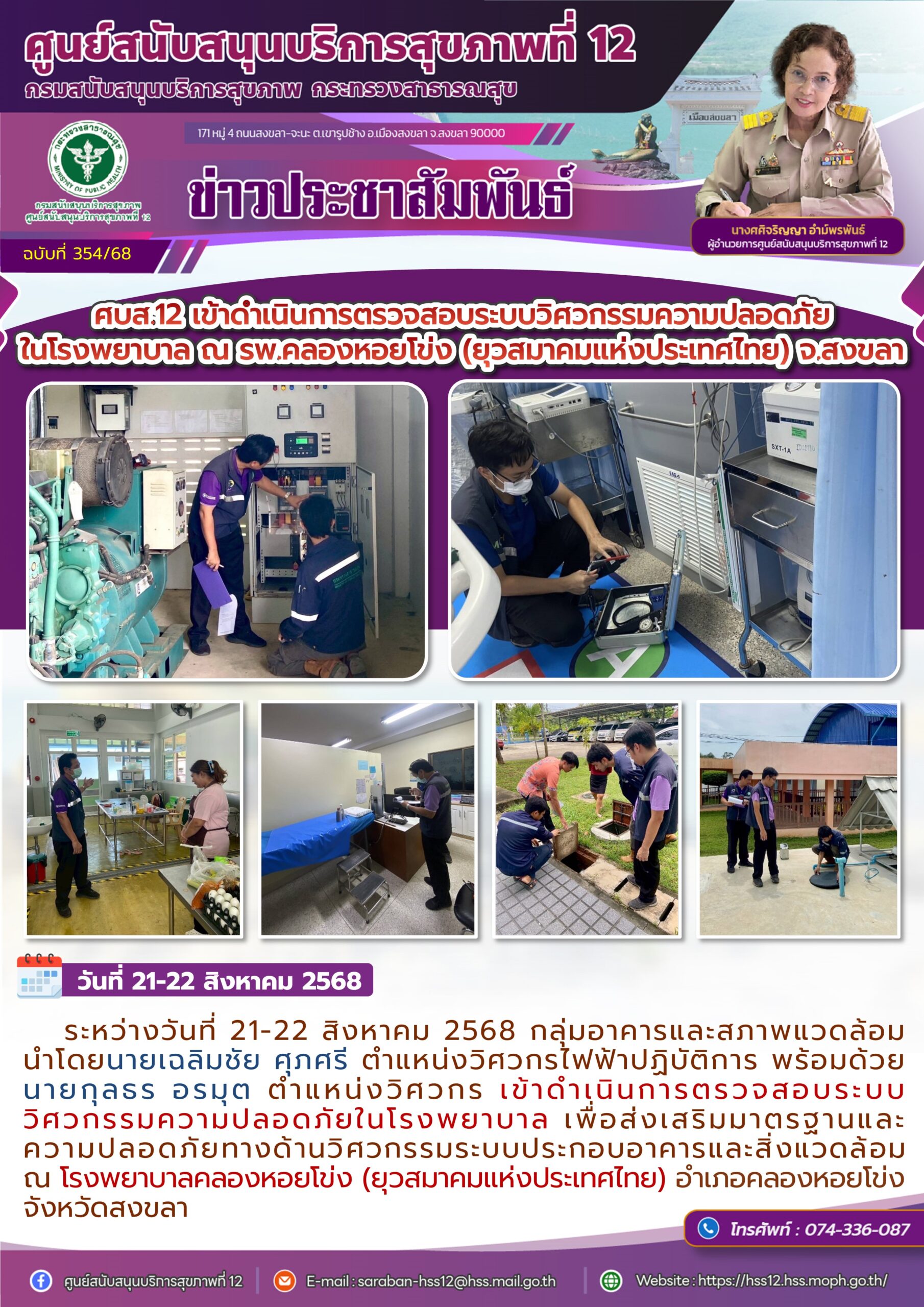 ศบส.12 เข้าดำเนินการตรวจสอบระบบวิศวกรรมความปลอดภัยในโรงพยาบาล ณ รพ.คลองหอยโข่ง (ยุวสมาคมแห่งประเทศไทย) จ.สงขลา