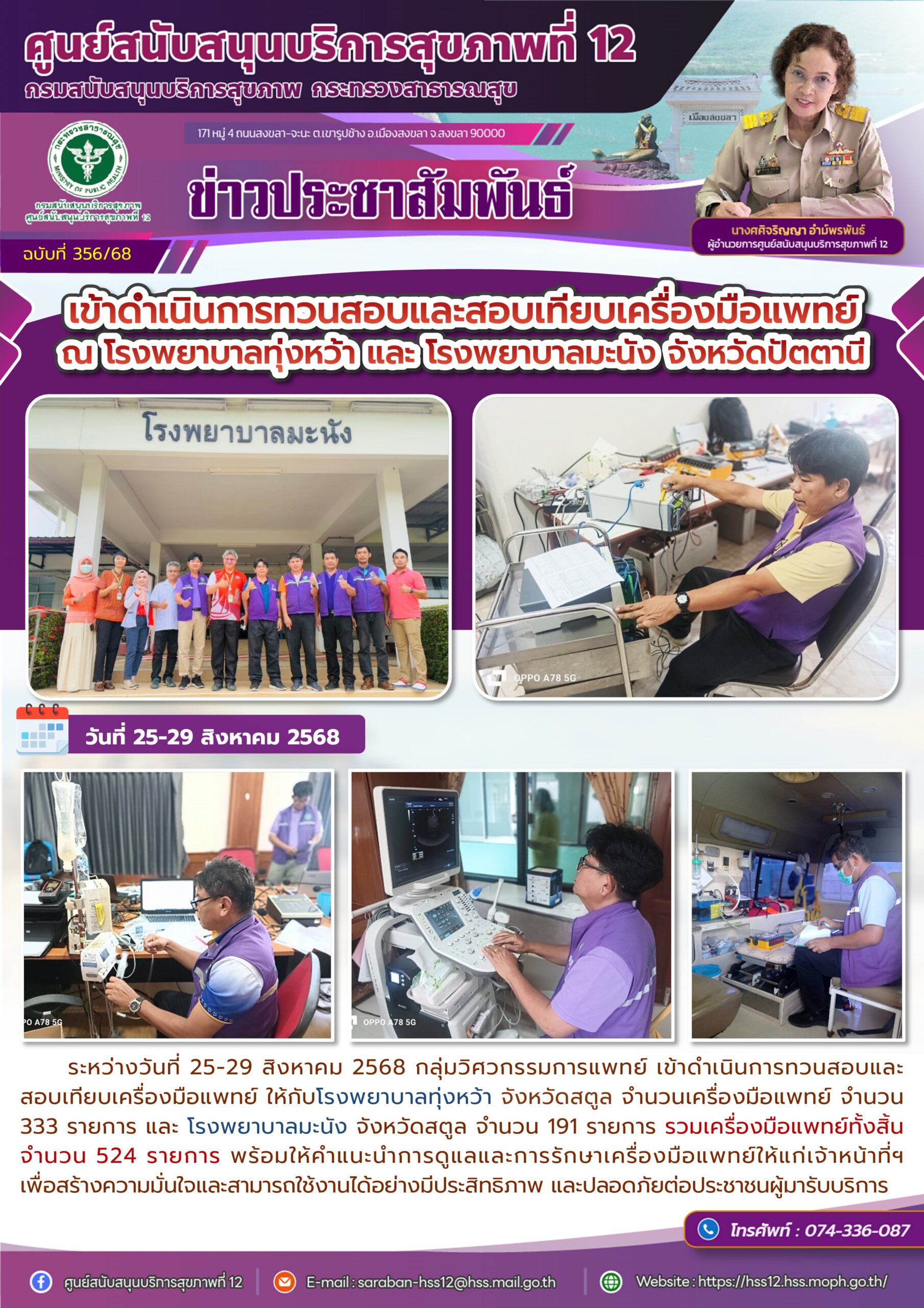 ระหว่างวันที่ 25-29 สิงหาคม 2568 กลุ่มวิศวกรรมการแพทย์ เข้าดำเนินการทวนสอบและสอบเทียบเครื่องมือแพทย์ ให้กับโรงพยาบาลทุ่งหว้า จังหวัดสตูล จำนวนเครื่องมือแพทย์ จำนวน 333 รายการ และ โรงพยาบาลมะนัง จังหวัดสตูล จำนวน 191 รายการ รวมเครื่องมือแพทย์ทั้งสิ้น จำนวน 524 รายการ พร้อมให้คำแนะนำการดูแลและการรักษาเครื่องมือแพทย์ให้แก่เจ้าหน้าที่ฯ เพื่อสร้างความมั่นใจและสามารถใช้งานได้อย่างมีประสิทธิภาพ และปลอดภัยต่อประชาชนผู้มารับบริการ