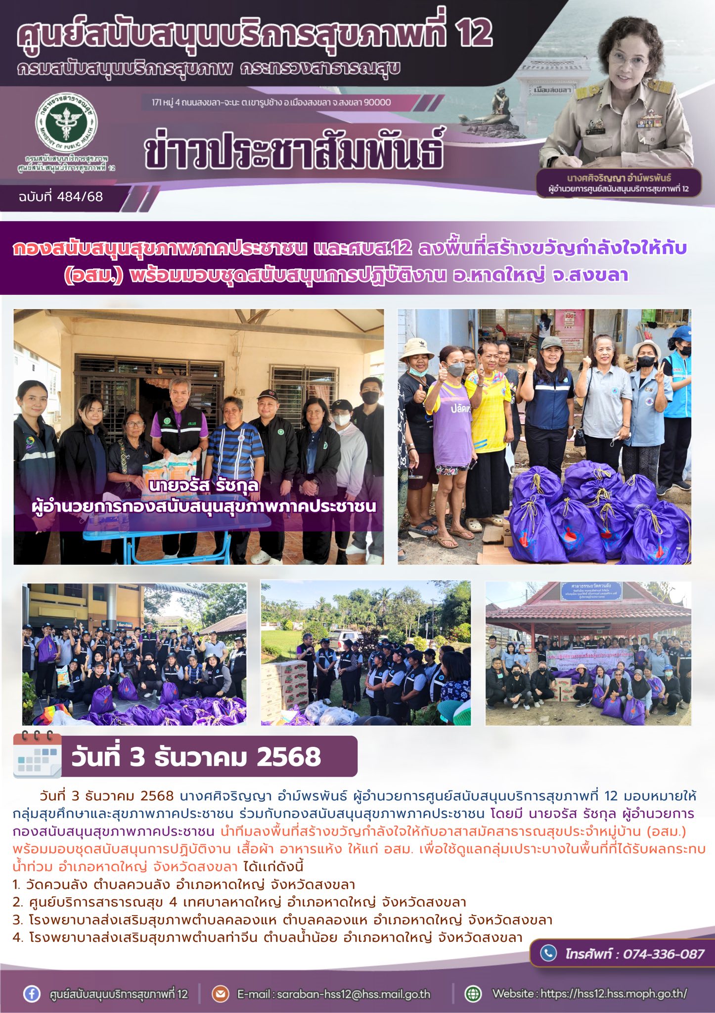 วันที่ 3 ธันวาคม 2568 นางศศิจริญญา อำม์พรพันธ์ ผู้อำนวยการศูนย์สนับสนุนบริการสุขภาพที่ 12 มอบหมายให้กลุ่มสุขศึกษาและสุขภาพภาคประชาชน ร่วมกับกองสนับสนุนสุขภาพภาคประชาชน โดยมี นายจรัส รัชกุล ผู้อำนวยการกองสนับสนุนสุขภาพภาคประชาชน นำทีมลงพื้นที่สร้างขวัญกำลังใจให้กับอาสาสมัคสาธารณสุขประจำหมู่บ้าน (อสม.) พร้อมมอบชุดสนับสนุนการปฏิบัติงาน เสื้อผ้า อาหารแห้ง ให้แก่ อสม. เพื่อใช้ดูแลกลุ่มเปราะบางในพื้นที่ที่ได้รับผลกระทบน้ำท่วม อำเภอหาดใหญ่ จังหวัดสงขลา ได้เเก่ดังนี้