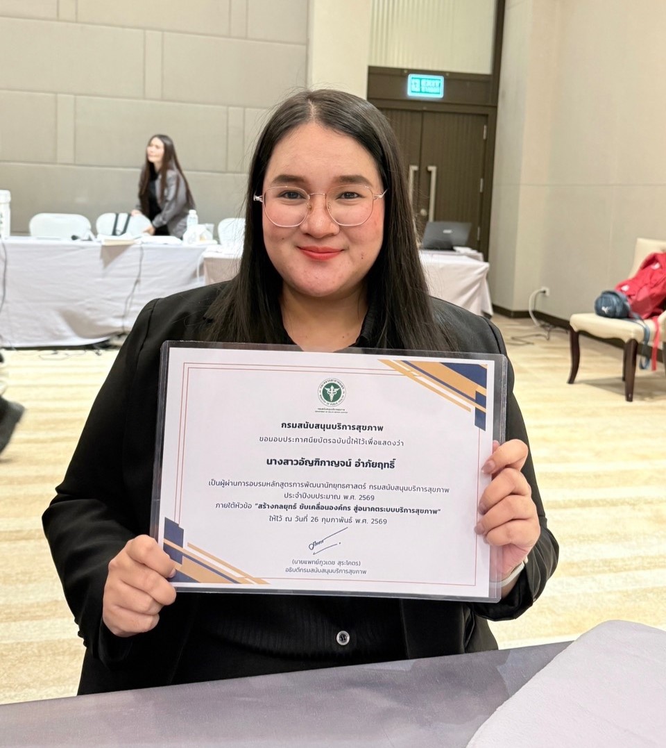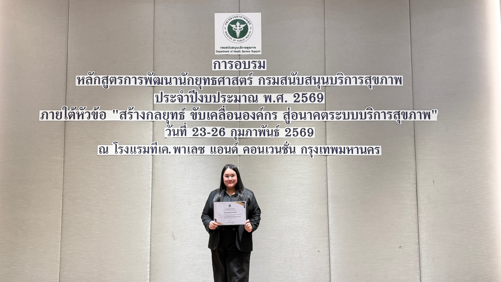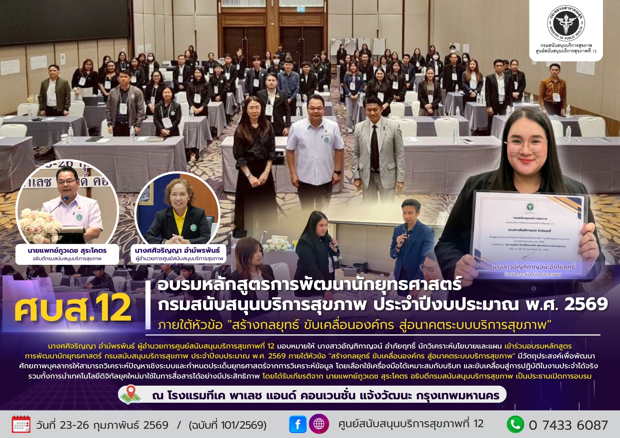 ระหว่างวันที่ 23-26 กุมภาพันธ์ 2569 นางศศิจริญญา อำม์พรพันธ์ ผู้อำนวยการศูนย์สนับสนุนบริการสุขภาพที่ 12 มอบหมายให้ นางสาวอัญฑิกาญจน์ อำภัยฤทธิ์ นักวิเคราะห์นโยบายและแผน กลุ่มบริหารงานทั่วไป เข้าร่วมอบรมหลักสูตรการพัฒนานักยุทธศาสตร์ กรมสนับสนุนบริการสุขภาพ ประจำปีงบประมาณ พ.ศ. 2569 ภายใต้หัวข้อ “สร้างกลยุทธ์ ขับเคลื่อนองค์กร สู่อนาคตระบบบริการสุขภาพ” มีวัตถุประสงค์เพื่อพัฒนาศักยภาพบุคลากรให้สามารถวิเคราะห์ปัญหาเชิงระบบและกำหนดประเด็นยุทธศาสตร์จากการวิเคราะห์ข้อมูล โดยเลือกใช้เครื่องมือได้เหมาะสมกับบริบท และขับเคลื่อนสู่การปฏิบัติในงานประจำได้จริง รวมทั้งการนำเทคโนโลยีดิจิทัลยุคใหม่มาใช้ในการสื่อสารได้อย่างมีประสิทธิภาพ โดยได้รับเกียรติจาก นายแพทย์ภูวเดช สุระโคตร อธิบดีกรมสนับสนุนบริการสุขภาพ เป็นประธานเปิดการอบรม ณ โรงแรมทีเค พาเลช แอนด์ คอนเวนชั่น แจ้งวัฒนะ กรุงเทพมหานคร