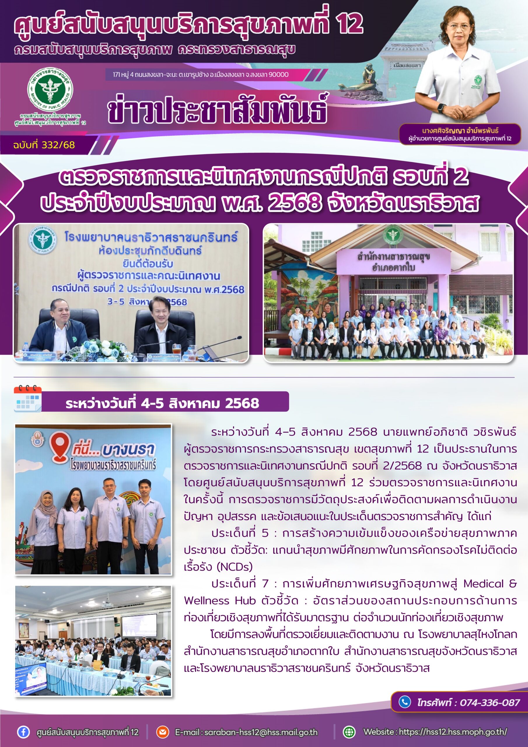 ระหว่างวันที่ 4–5 สิงหาคม 2568 นายแพทย์อภิชาติ วชิรพันธ์ ผู้ตรวจราชการกระทรวงสาธารณสุข เขตสุขภาพที่ 12 เป็นประธานในการตรวจราชการและนิเทศงานกรณีปกติ รอบที่ 2/2568 ณ จังหวัดนราธิวาส โดยศูนย์สนับสนุนบริการสุขภาพที่ 12 ร่วมตรวจราชการและนิเทศงานในครั้งนี้ การตรวจราชการมีวัตถุประสงค์เพื่อติดตามผลการดำเนินงาน ปัญหา อุปสรรค และข้อเสนอแนะในประเด็นตรวจราชการสำคัญ ได้แก่