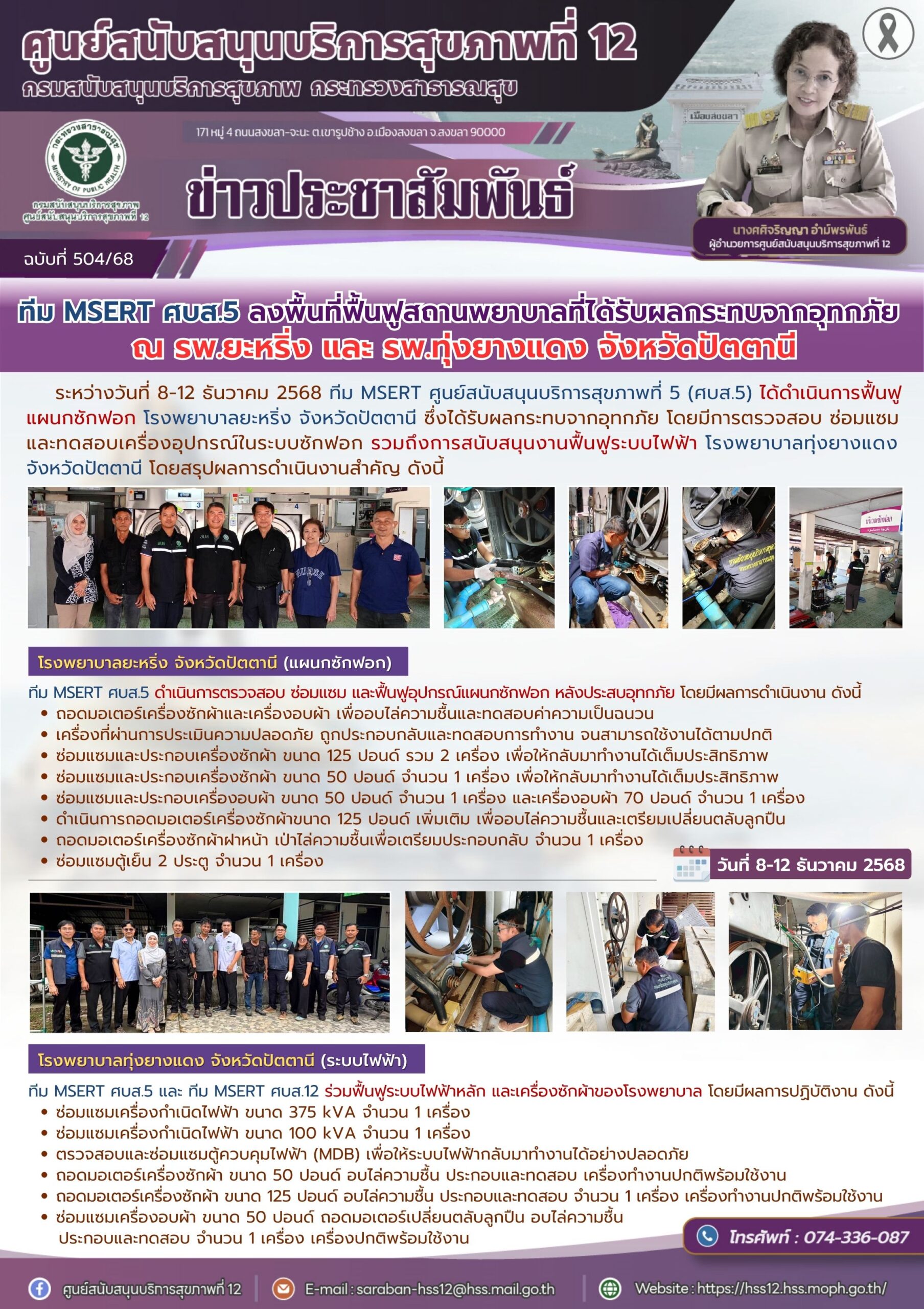 ระหว่างวันที่ 8-12 ธันวาคม 2568 ทีม MSERT ศูนย์สนับสนุนบริการสุขภาพที่ 5 (ศบส.5) ได้ดำเนินการฟื้นฟูแผนกซักฟอก โรงพยาบาลยะหริ่ง จังหวัดปัตตานี ซึ่งได้รับผลกระทบจากอุทกภัย โดยมีการตรวจสอบ ซ่อมแซมและทดสอบเครื่องอุปกรณ์ในระบบซักฟอก รวมถึงการสนับสนุนงานฟื้นฟูระบบไฟฟ้า โรงพยาบาลทุ่งยางแดง จังหวัดปัตตานี โดยสรุปผลการดำเนินงานสำคัญ ดังนี้