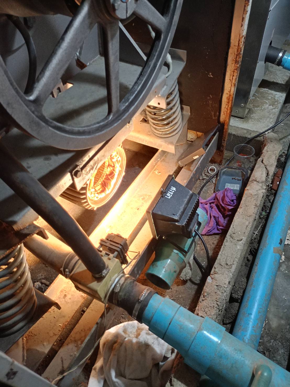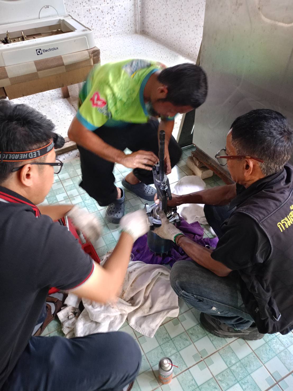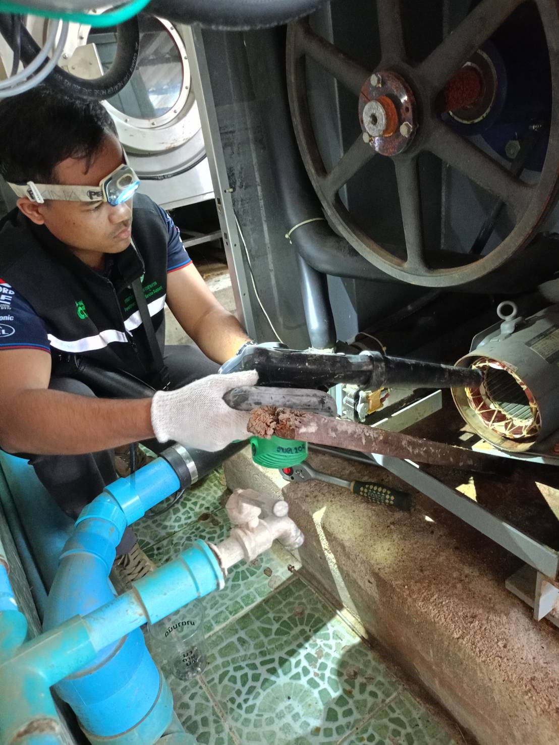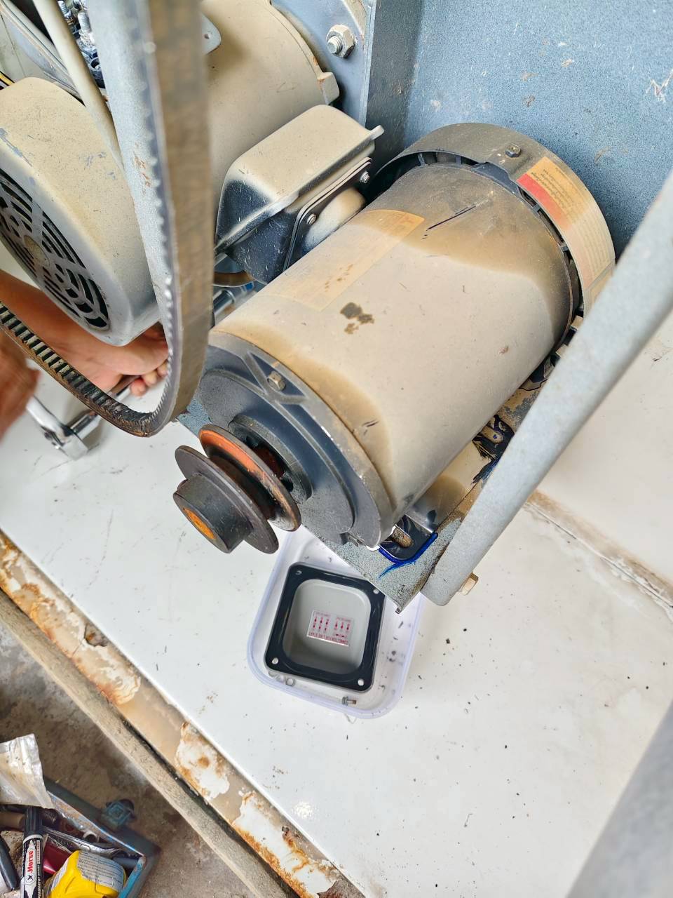 ดำเนินการถอดมอเตอร์เครื่องซักผ้าขนาด 125 ปอนด์ เพิ่มเติม เพื่ออบไล่ความชื้นและเตรียมเปลี่ยนตลับลูกปืน