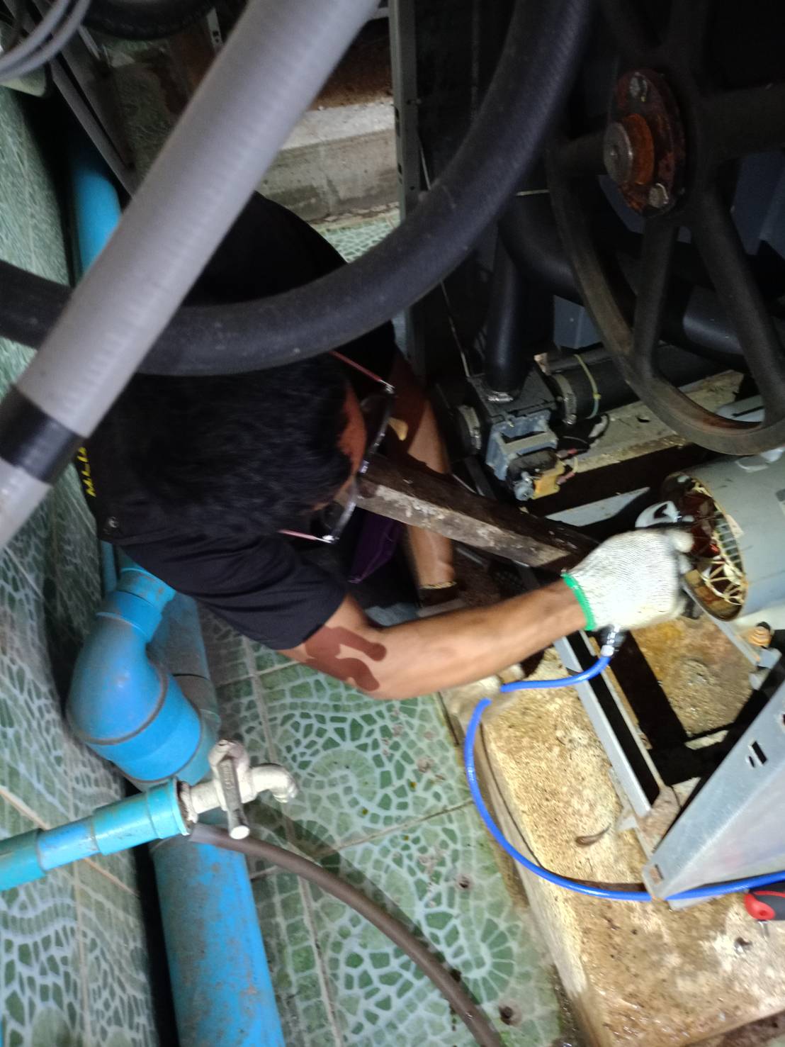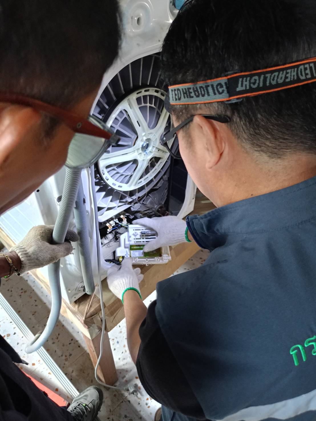 ถอดมอเตอร์เครื่องซักผ้าฝาหน้า เป่าไล่ความชื้นเพื่อเตรียมประกอบกลับ จำนวน 1 เครื่อง