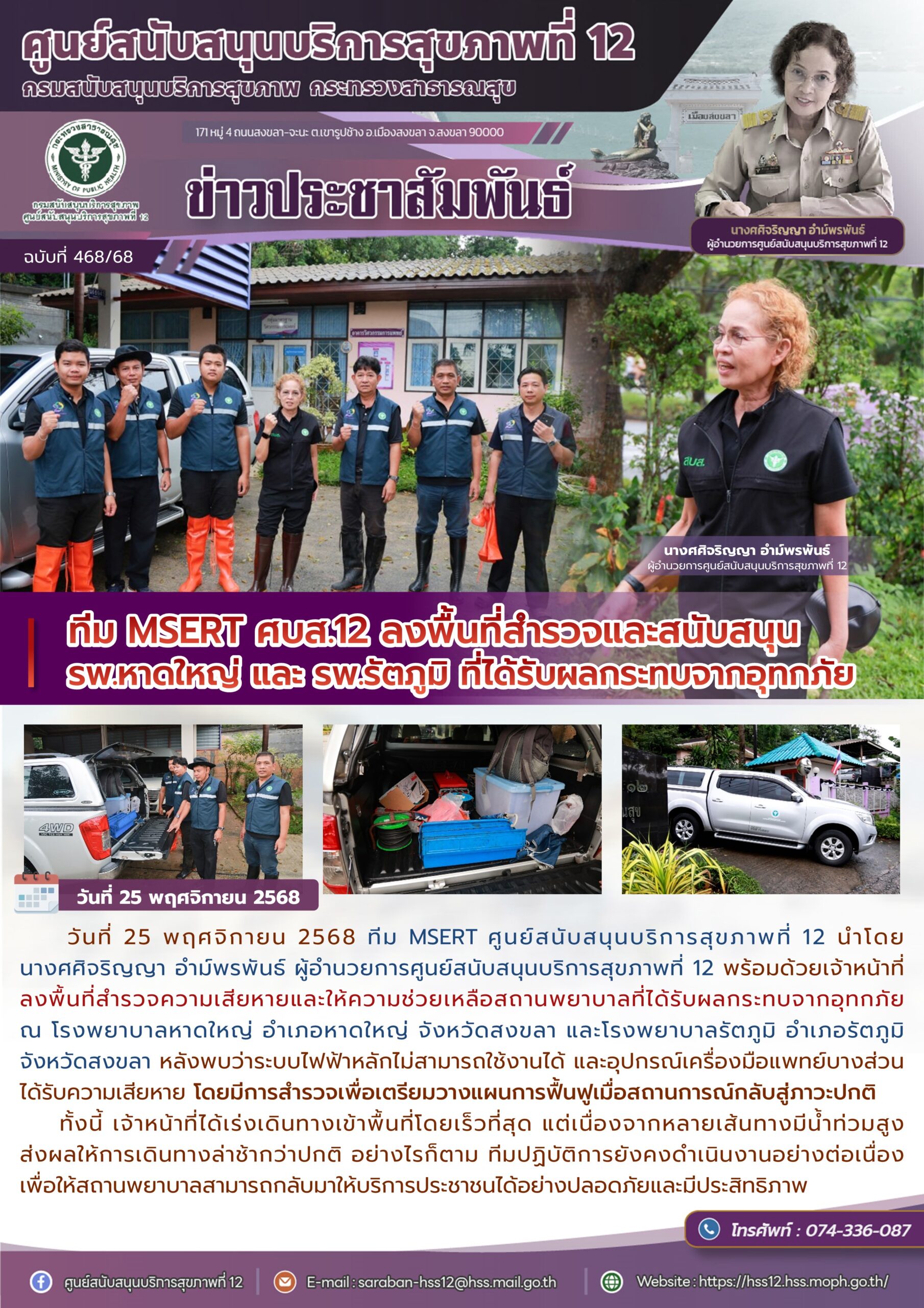 ทีม MSERT ศบส.12 ลงพื้นที่สำรวจและสนับสนุน รพ.หาดใหญ่ และ รพ.รัตภูมิ ที่ได้รับผลกระทบจากอุทกภัย