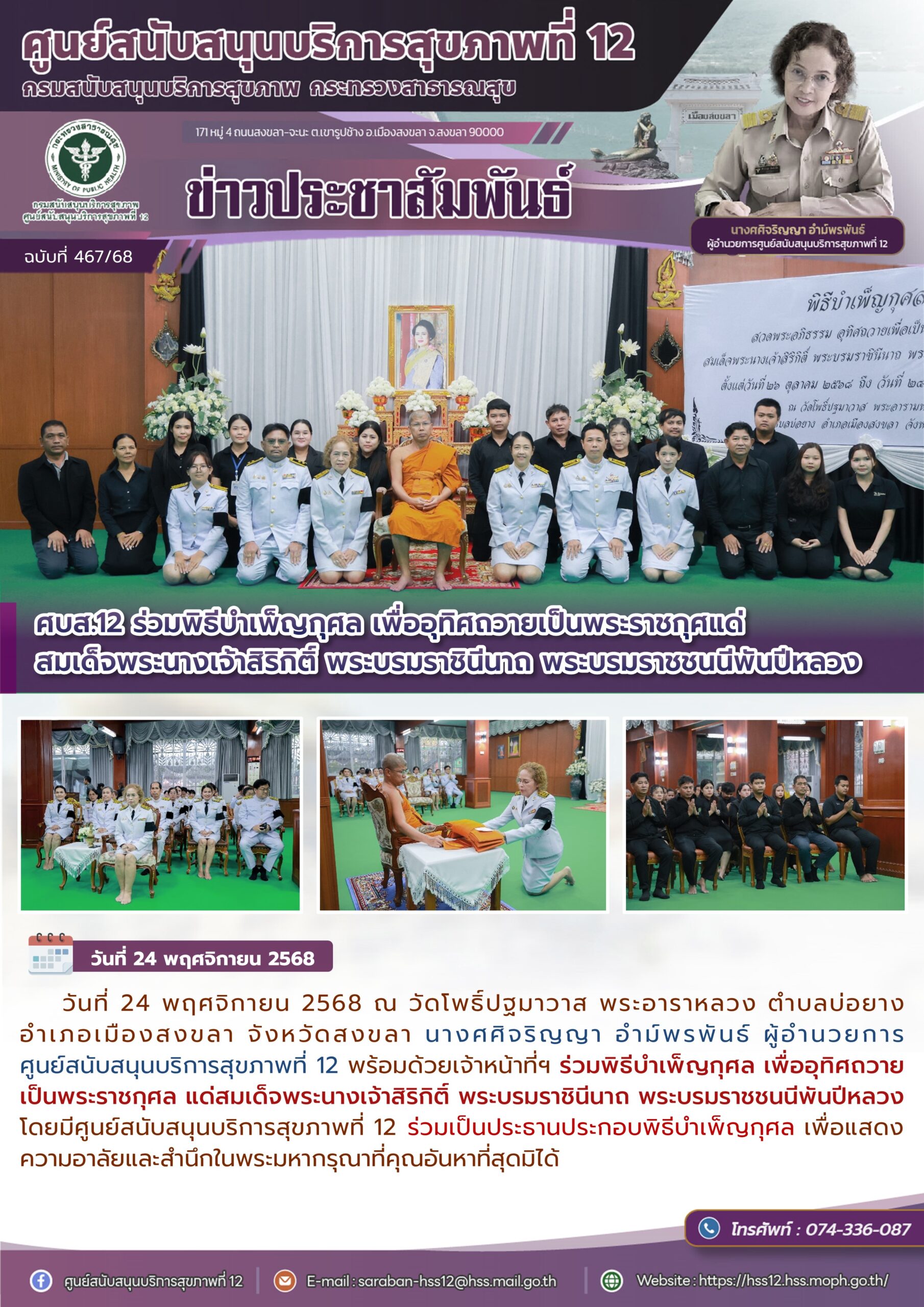 วันที่ 24 พฤศจิกายน 2568 ณ วัดโพธิ์ปฐมาวาส พระอาราหลวง ตำบลบ่อยาง อำเภอเมืองสงขลา จังหวัดสงขลา นางศศิจริญญา อำม์พรพันธ์ ผู้อำนวยการศูนย์สนับสนุนบริการสุขภาพที่ 12 พร้อมด้วยเจ้าหน้าที่ฯ ร่วมพิธีบำเพ็ญกุศล เพื่ออุทิศถวายเป็นพระราชกุศล แด่สมเด็จพระนางเจ้าสิริกิติ์ พระบรมราชินีนาถ พระบรมราชชนนีพันปีหลวง โดยมีศูนย์สนับสนุนบริการสุขภาพที่ 12 ร่วมเป็นประธานประกอบพิธีบำเพ็ญกุศล เพื่อแสดงความอาลัยและสำนึกในพระมหากรุณาที่คุณอันหาที่สุดมิได้