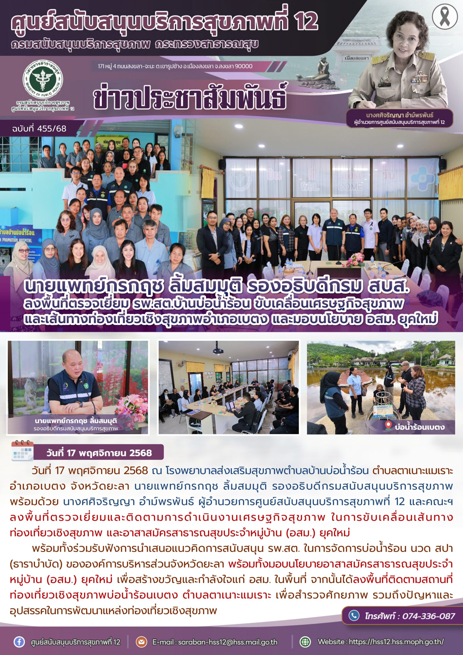 วันที่ 17 พฤศจิกายน 2568 ณ โรงพยาบาลส่งเสริมสุขภาพตำบลบ้านบ่อน้ำร้อน ตำบลตาเนาะแมเราะ อำเภอเบตง จังหวัดยะลา นายแพทย์กรกฤช ลิ้มสมมุติ รองอธิบดีกรมสนับสนุนบริการสุขภาพ พร้อมด้วย นางศศิจริญญา อำม์พรพันธ์ ผู้อำนวยการศูนย์สนับสนุนบริการสุขภาพที่ 12 และคณะฯ ลงพื้นที่ตรวจเยี่ยมและติดตามการดำเนินงานเศรษฐกิจสุขภาพ ในการขับเคลื่อนเส้นทางท่องเที่ยวเชิงสุขภาพ และอาสาสมัครสาธารณสุขประจำหมู่บ้าน (อสม.) ยุคใหม่