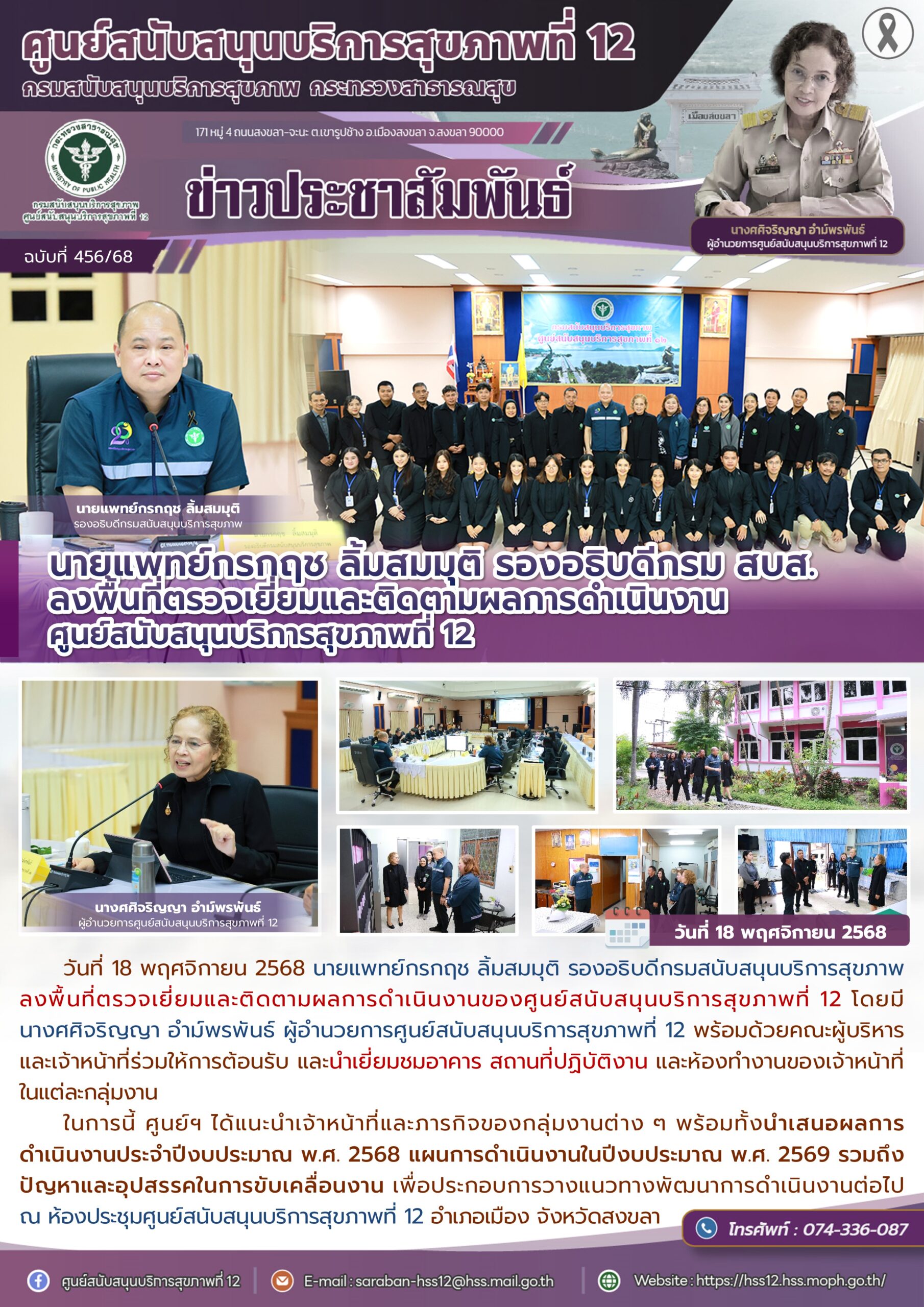วันที่ 18 พฤศจิกายน 2568 นายแพทย์กรกฤช ลิ้มสมมุติ รองอธิบดีกรมสนับสนุนบริการสุขภาพ ลงพื้นที่ตรวจเยี่ยมและติดตามผลการดำเนินงานของศูนย์สนับสนุนบริการสุขภาพที่ 12 โดยมี นางศศิจริญญา อำม์พรพันธ์ ผู้อำนวยการศูนย์สนับสนุนบริการสุขภาพที่ 12 พร้อมด้วยคณะผู้บริหาร และเจ้าหน้าที่ร่วมให้การต้อนรับ และนำเยี่ยมชมอาคาร สถานที่ปฏิบัติงาน และห้องทำงานของเจ้าหน้าที่ในแต่ละกลุ่มงาน