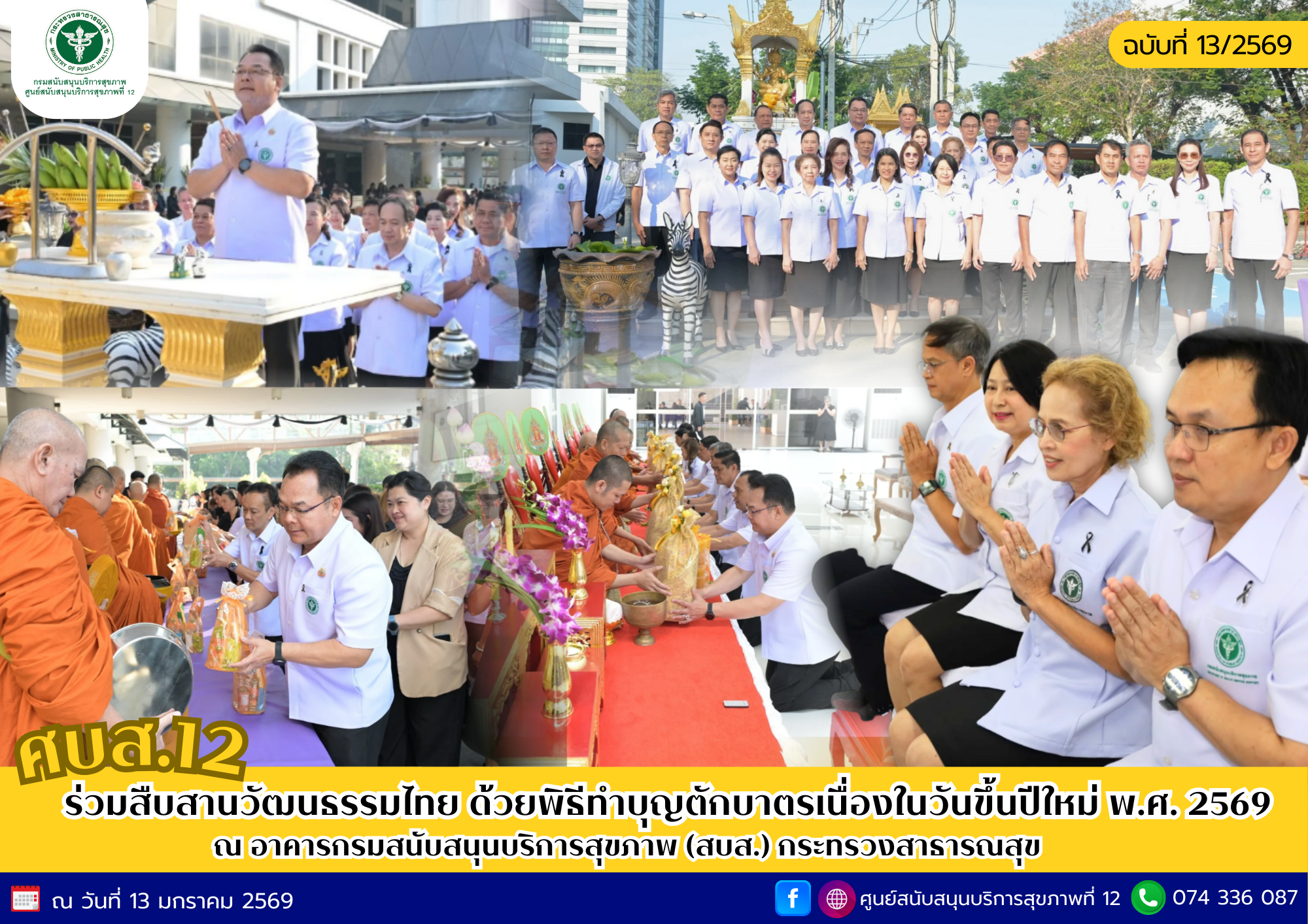 วันที่ 13 มกราคม 2569 ศูนย์สนับสนุนบริการสุขภาพที่ 12 ร่วมสืบสานวัฒนธรรมไทย จัดพิธีทำบุญตักบาตรเนื่องในโอกาสวันขึ้นปีใหม่ พุทธศักราช 2569 เพื่อความเป็นสิริมงคลแก่ผู้บริหารและบุคลากร