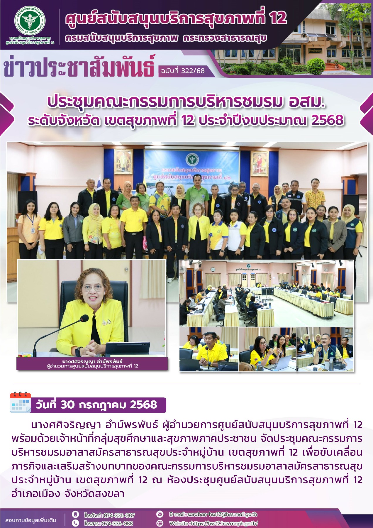 วันที่ 30 กรกฎาคม 2568 นางศศิจริญญา อำม์พรพันธ์ ผู้อำนวยการศูนย์สนับสนุนบริการสุขภาพที่ 12 พร้อมด้วยเจ้าหน้าที่กลุ่มสุขศึกษาและสุขภาพภาคประชาชน จัดประชุมคณะกรรมการบริหารชมรมอาสาสมัครสาธารณสุขประจำหมู่บ้าน เขตสุขภาพที่ 12 เพื่อขับเคลื่อนภารกิจและเสริมสร้างบทบาทของคณะกรรมการบริหารชมรมอาสาสมัครสาธารณสุขประจำหมู่บ้าน เขตสุขภาพที่ 12 ณ ห้องประชุมศูนย์สนับสนุนบริการสุขภาพที่ 12 อำเภอเมือง จังหวัดสงขลา