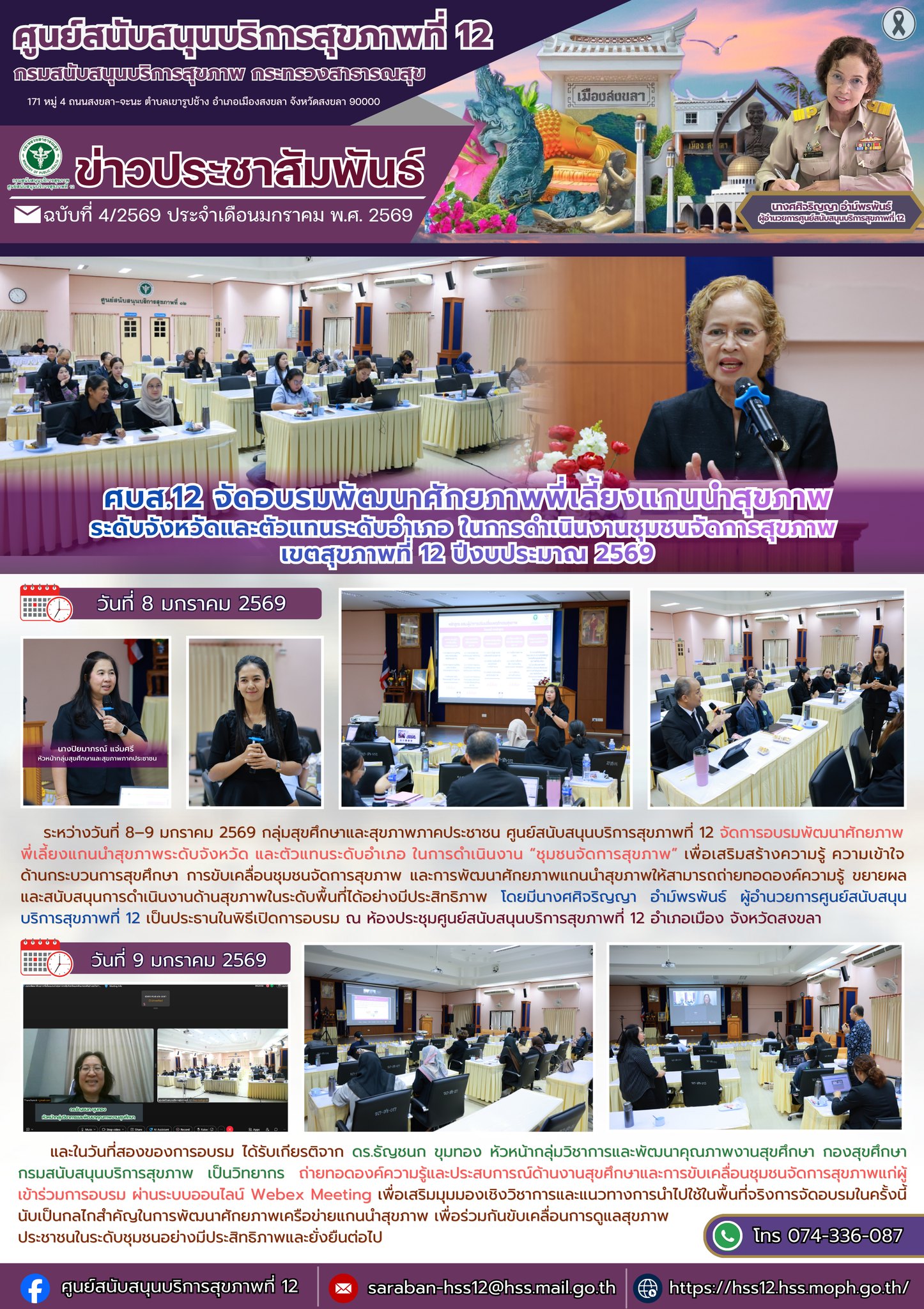 ระหว่างวันที่ 8–9 มกราคม 2569 กลุ่มสุขศึกษาและสุขภาพภาคประชาชน ศูนย์สนับสนุนบริการสุขภาพที่ 12 จัดการอบรมพัฒนาศักยภาพพี่เลี้ยงแกนนำสุขภาพระดับจังหวัด และตัวแทนระดับอำเภอ ในการดำเนินงาน “ชุมชนจัดการสุขภาพ” เพื่อเสริมสร้างความรู้ ความเข้าใจด้านกระบวนการสุขศึกษา การขับเคลื่อนชุมชนจัดการสุขภาพ และการพัฒนาศักยภาพแกนนำสุขภาพให้สามารถถ่ายทอดองค์ความรู้ ขยายผล และสนับสนุนการดำเนินงานด้านสุขภาพในระดับพื้นที่ได้อย่างมีประสิทธิภาพ โดยมีนางศศิจริญญา อำม์พรพันธ์ ผู้อำนวยการศูนย์สนับสนุนบริการสุขภาพที่ 12 เป็นประธานในพิธีเปิดการอบรม ณ ห้องประชุมศูนย์สนับสนุนบริการสุขภาพที่ 12 อำเภอเมือง จังหวัดสงขลา