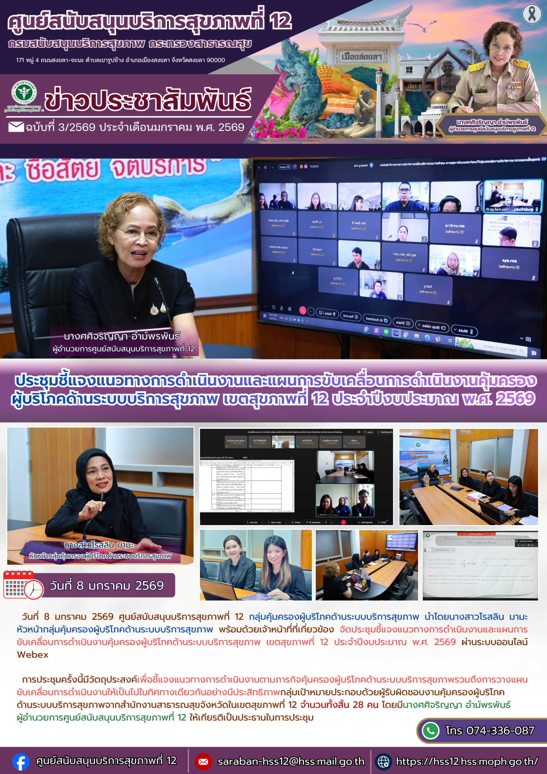 วันที่ 8 มกราคม 2569 ศูนย์สนับสนุนบริการสุขภาพที่ 12 กลุ่มคุ้มครองผู้บริโภคด้านระบบบริการสุขภาพ นำโดยนางสาวโรสลิน มามะ หัวหน้ากลุ่มคุ้มครองผู้บริโภคด้านระบบบริการสุขภาพ พร้อมด้วยเจ้าหน้าที่ที่เกี่ยวข้อง จัดประชุมชี้แจงแนวทางการดำเนินงานและแผนการขับเคลื่อนการดำเนินงานคุ้มครองผู้บริโภคด้านระบบบริการสุขภาพ เขตสุขภาพที่ 12 ประจำปีงบประมาณ พ.ศ. 2569 ผ่านระบบออนไลน์ Webex