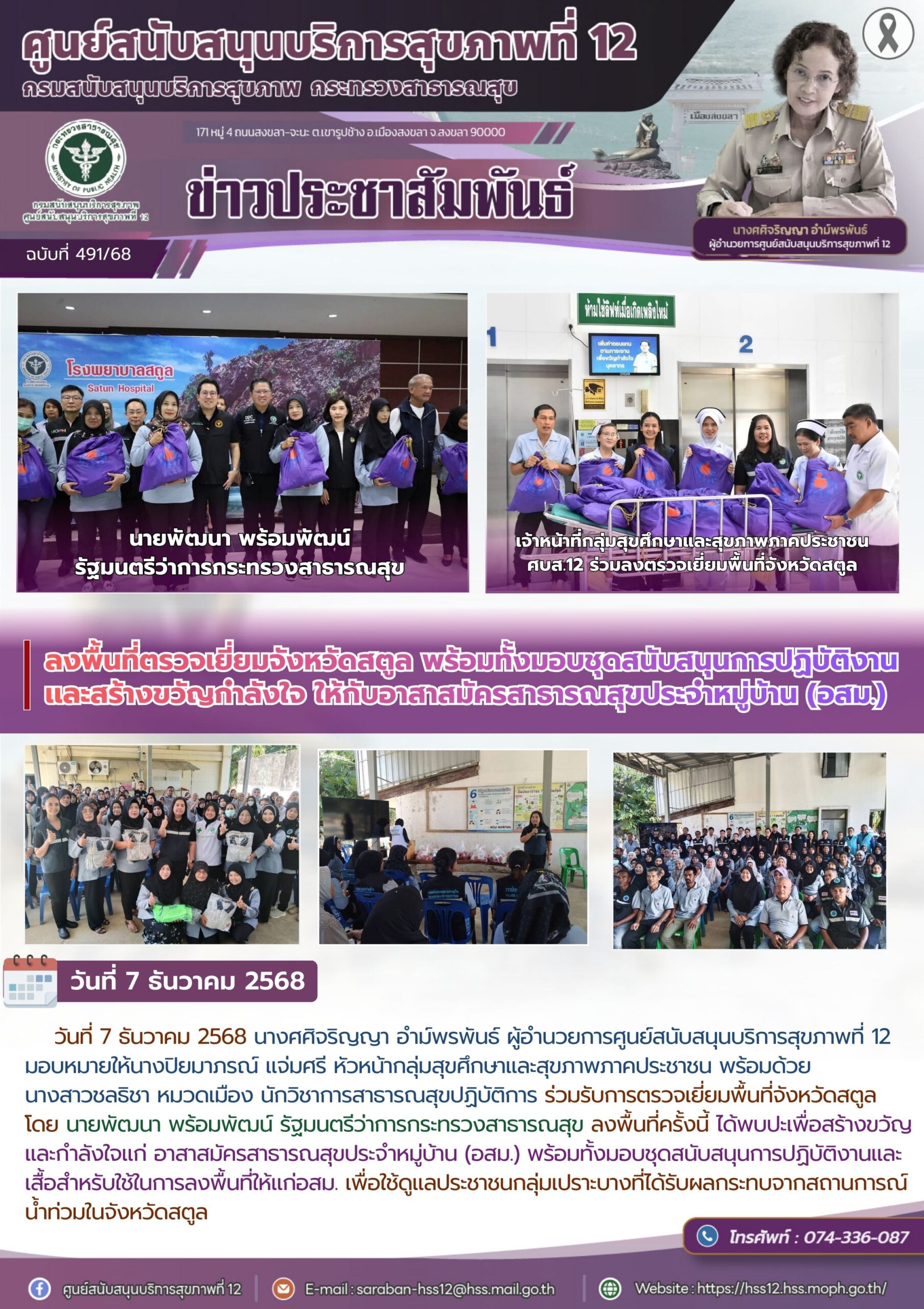 วันที่ 7 ธันวาคม 2568 นางศศิจริญญา อำม์พรพันธ์ ผู้อำนวยการศูนย์สนับสนุนบริการสุขภาพที่ 12 มอบหมายให้นางปิยมาภรณ์ แจ่มศรี หัวหน้ากลุ่มสุขศึกษาและสุขภาพภาคประชาชน พร้อมด้วย นางสาวชลธิชา หมวดเมือง นักวิชาการสาธารณสุขปฏิบัติการ ร่วมรับการตรวจเยี่ยมพื้นที่จังหวัดสตูล โดย นายพัฒนา พร้อมพัฒน์ รัฐมนตรีว่าการกระทรวงสาธารณสุข ลงพื้นที่ครั้งนี้ ได้พบปะเพื่อสร้างขวัญและกำลังใจแก่ อาสาสมัครสาธารณสุขประจำหมู่บ้าน (อสม.) พร้อมทั้งมอบชุดสนับสนุนการปฏิบัติงานและเสื้อสำหรับใช้ในการลงพื้นที่ให้แก่อสม. เพื่อใช้ดูแลประชาชนกลุ่มเปราะบางที่ได้รับผลกระทบจากสถานการณ์น้ำท่วมในจังหวัดสตูล