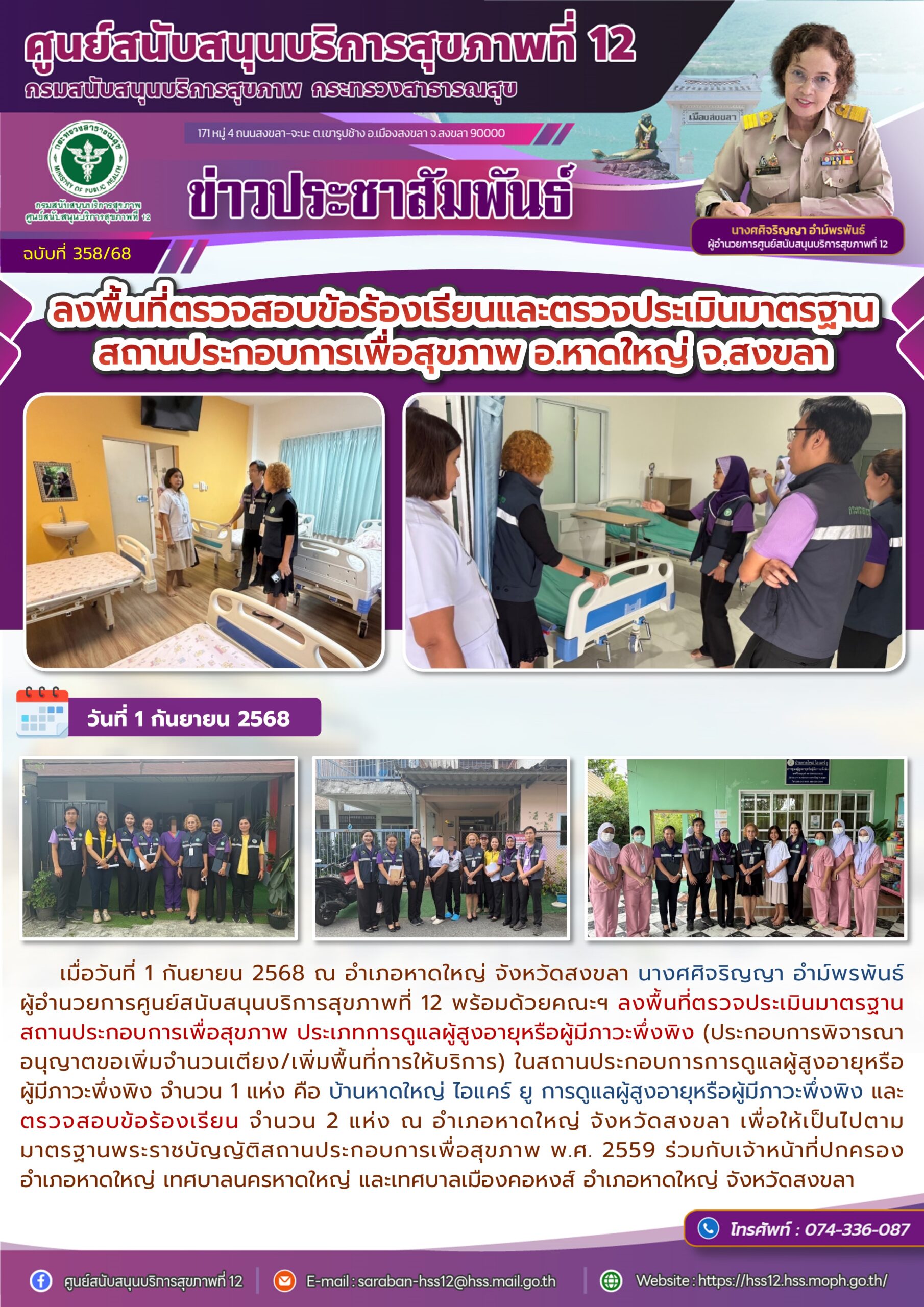 เมื่อวันที่ 1 กันยายน 2568 ณ อำเภอหาดใหญ่ จังหวัดสงขลา นางศศิจริญญา อำม์พรพันธ์ ผู้อำนวยการศูนย์สนับสนุนบริการสุขภาพที่ 12 พร้อมด้วยคณะฯ ลงพื้นที่ตรวจประเมินมาตรฐานสถานประกอบการเพื่อสุขภาพ ประเภทการดูแลผู้สูงอายุหรือผู้มีภาวะพึ่งพิง (ประกอบการพิจารณาอนุญาตขอเพิ่มจำนวนเตียง/เพิ่มพื้นที่การให้บริการ) ในสถานประกอบการการดูแลผู้สูงอายุหรือผู้มีภาวะพึ่งพิง จำนวน 1 แห่ง คือ บ้านหาดใหญ่ ไอแคร์ ยู การดูแลผู้สูงอายุหรือผู้มีภาวะพึ่งพิง และตรวจสอบข้อร้องเรียน จำนวน 2 แห่ง ณ อำเภอหาดใหญ่ จังหวัดสงขลา เพื่อให้เป็นไปตามมาตรฐานพระราชบัญญัติสถานประกอบการเพื่อสุขภาพ พ.ศ. 2559 ร่วมกับเจ้าหน้าที่ปกครอง อำเภอหาดใหญ่ เทศบาลนครหาดใหญ่ และเทศบาลเมืองคอหงส์ อำเภอหาดใหญ่ จังหวัดสงขลา
