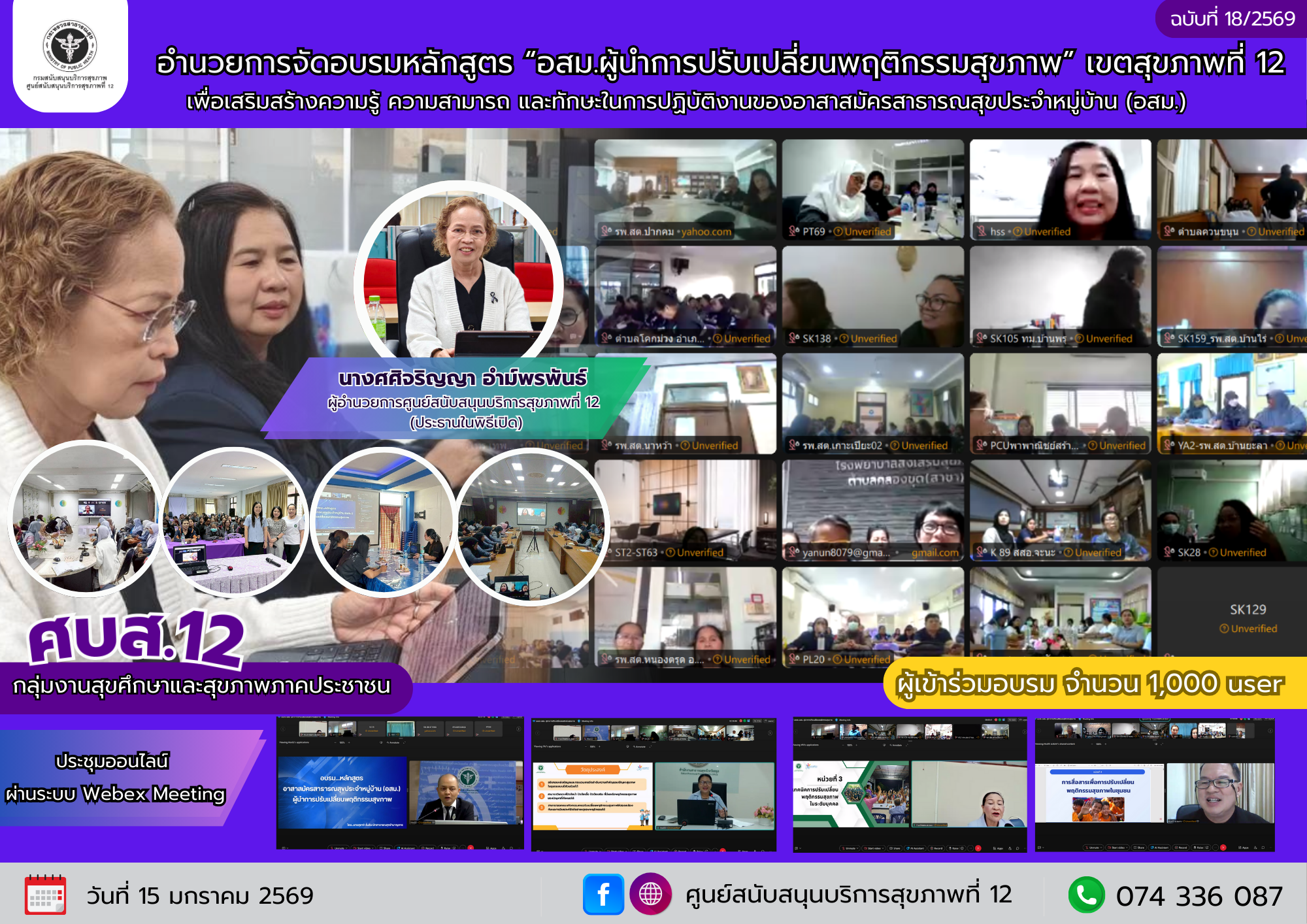 วันที่ 15 มกราคม 2569 กลุ่มสุขศึกษาและสุขภาพภาคประชาชน ศูนย์สนับสนุนบริการสุขภาพที่ 12 ร่วมกับเครือข่ายสุขศึกษาและการปรับเปลี่ยนพฤติกรรมสุขภาพระดับจังหวัด เขตสุขภาพที่ 12 อำนวยการอบรมหลักสูตร “อสม.ผู้นำการปรับเปลี่ยนพฤติกรรมสุขภาพ” เพื่อเสริมสร้างความรู้ ความสามารถ และทักษะในการปฏิบัติงานของอาสาสมัครสาธารณสุขประจำหมู่บ้าน (อสม.) ให้มีประสิทธิภาพยิ่งขึ้น