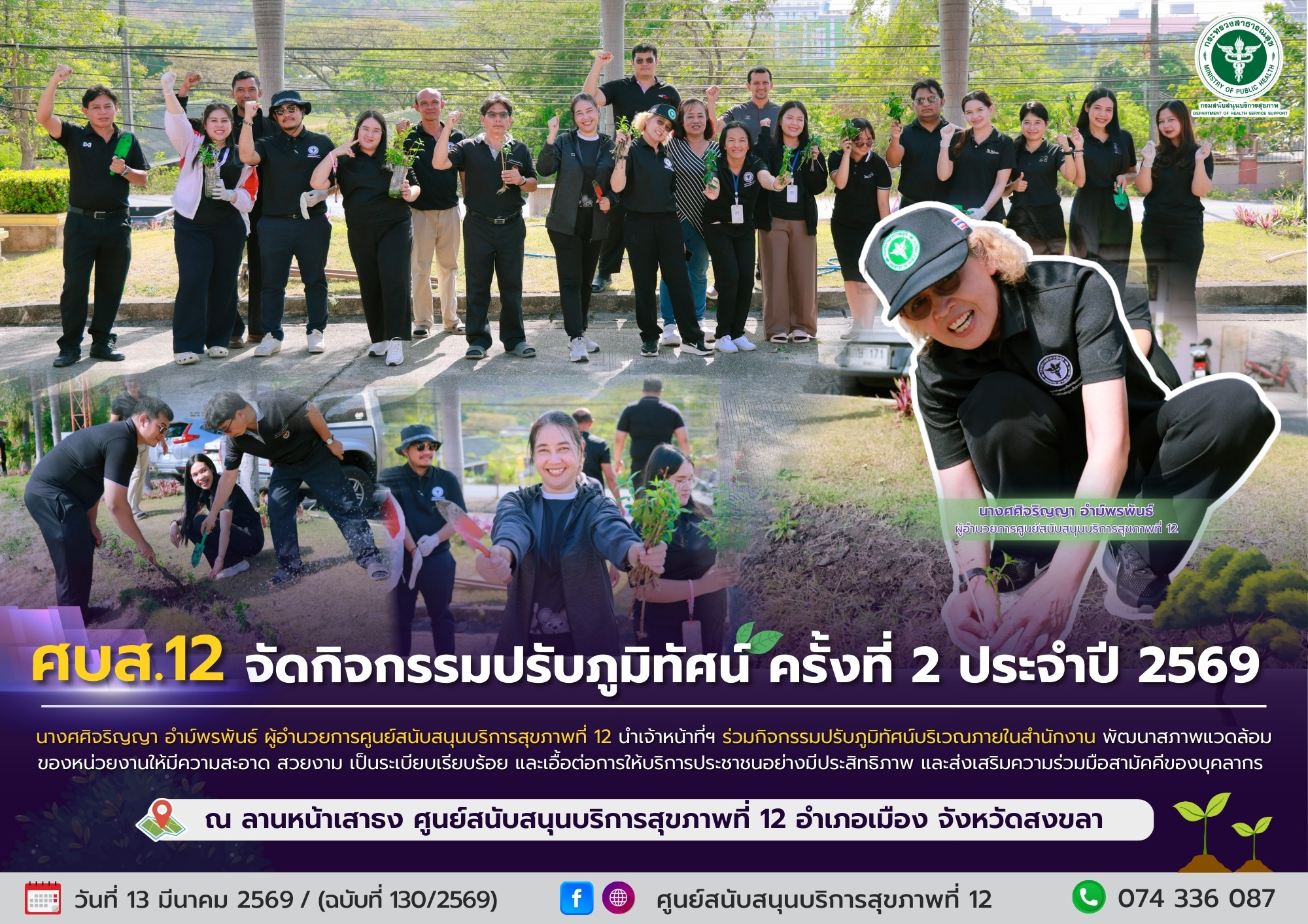 วันที่ 13 มีนาคม 2569 นางศศิจริญญา อำม์พรพันธ์ ผู้อำนวยการศูนย์สนับสนุนบริการสุขภาพที่ 12 นำเจ้าหน้าที่ร่วมกิจกรรมปรับภูมิทัศน์บริเวณภายในสำนักงาน เพื่อพัฒนาสภาพแวดล้อมของหน่วยงานให้มีความสะอาด สวยงาม เป็นระเบียบเรียบร้อย และเอื้อต่อการให้บริการประชาชนอย่างมีประสิทธิภาพ การดำเนินกิจกรรมในครั้งนี้ ยังเป็นการส่งเสริมความร่วมมือ ความสามัคคีของบุคลากรภายในหน่วยงาน ตลอดจนสร้างบรรยากาศการทำงานที่ดี ส่งผลให้เกิดภาพลักษณ์ที่เหมาะสมของหน่วยงานภาครัฐในการให้บริการประชาชน