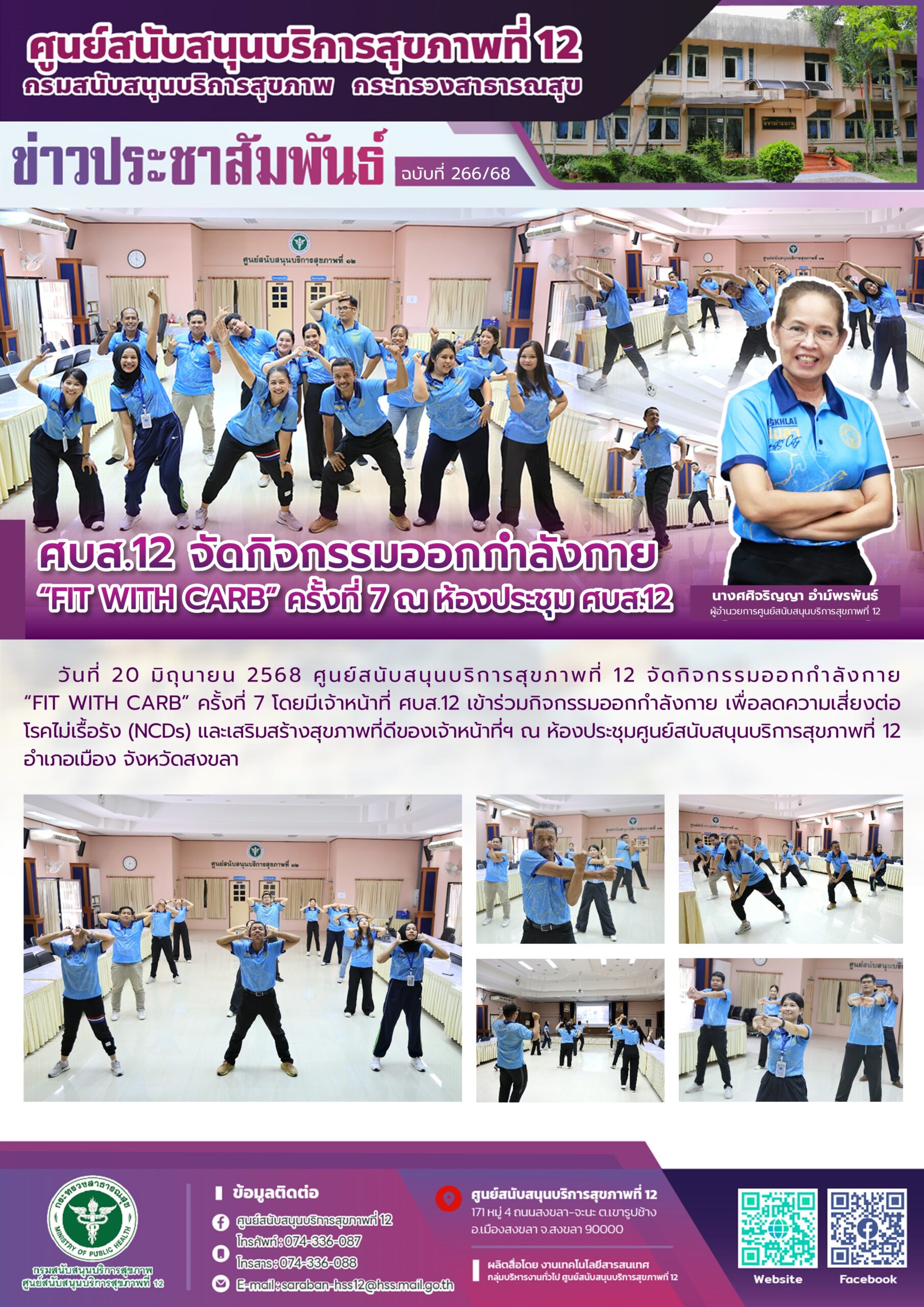 วันที่ 20 มิถุนายน 2568 ศูนย์สนับสนุนบริการสุขภาพที่ 12 จัดกิจกรรมออกกำลังกาย “FIT WITH CARB” ครั้งที่ 7 โดยมีเจ้าหน้าที่ ศบส.12 เข้าร่วมกิจกรรมออกกำลังกาย เพื่อลดความเสี่ยงต่อโรคไม่เรื้อรัง (NCDs) และเสริมสร้างสุขภาพที่ดีของเจ้าหน้าที่ฯ ณ ห้องประชุมศูนย์สนับสนุนบริการสุขภาพที่ 12 อำเภอเมือง จังหวัดสงขลา
