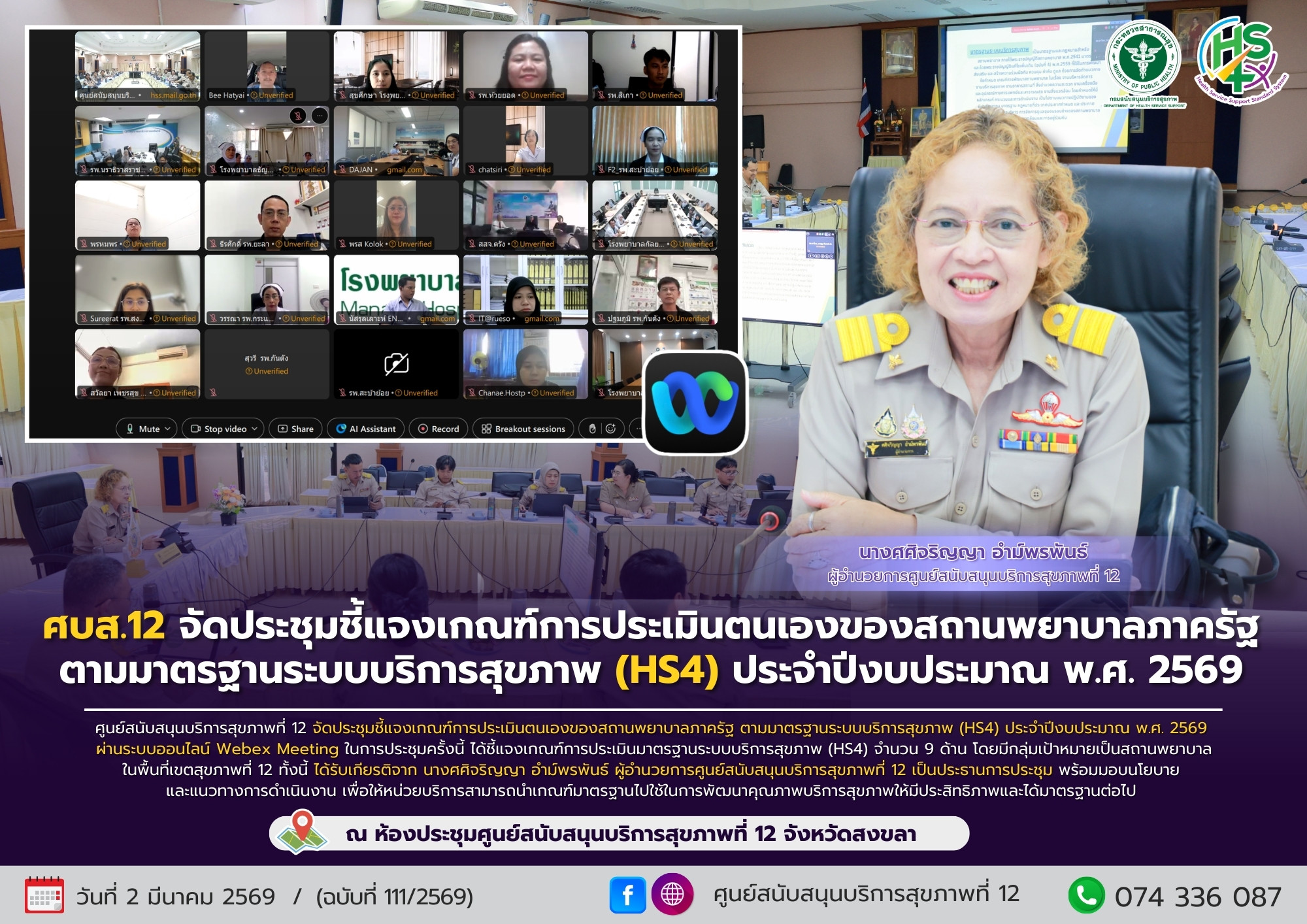 วันที่ 2 มีนาคม 2569 ศูนย์สนับสนุนบริการสุขภาพที่ 12 จัดประชุมชี้แจงเกณฑ์การประเมินตนเองของสถานพยาบาลภาครัฐ ตามมาตรฐานระบบบริการสุขภาพ (HS4) ประจำปีงบประมาณ พ.ศ. 2569 ผ่านระบบออนไลน์ Webex Meeting ในการประชุมครั้งนี้ ได้ชี้แจงเกณฑ์การประเมินมาตรฐานระบบบริการสุขภาพ (HS4) จำนวน 9 ด้าน โดยมีกลุ่มเป้าหมายเป็นสถานพยาบาล ในพื้นที่เขตสุขภาพที่ 12 ทั้งนี้ ได้รับเกียรติจาก นางศศิจริญญา อำม์พรพันธ์ ผู้อำนวยการศูนย์สนับสนุนบริการสุขภาพที่ 12 เป็นประธานการประชุม พร้อมมอบนโยบายและแนวทางการดำเนินงาน เพื่อให้หน่วยบริการสามารถนำเกณฑ์มาตรฐานไปใช้ในการพัฒนาคุณภาพบริการสุขภาพให้มีประสิทธิภาพและได้มาตรฐานต่อไป ณ ห้องประชุมศูนย์สนับสนุนบริการสุขภาพที่ 12 จังหวัดสงขลา