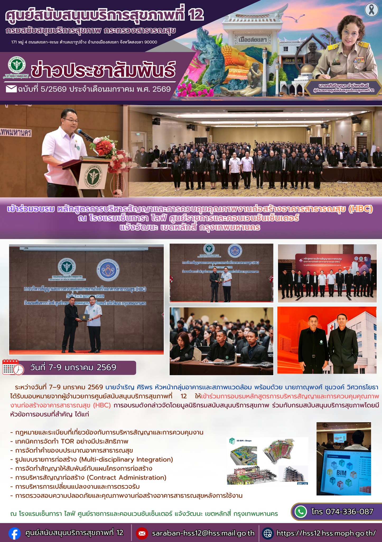 ได้รับมอบหมายจากผู้อำนวยการศูนย์สนับสนุนบริการสุขภาพที่ 12 ให้เข้าร่วมการอบรมหลักสูตรการบริหารสัญญาและการควบคุมคุณภาพ งานก่อสร้างอาคารสาธารณสุข (HBC) การอบรมดังกล่าวจัดโดยมูลนิธิกรมสนับสนุนบริการสุขภาพ ร่วมกับกรมสนับสนุนบริการสุขภาพโดยมีหัวข้อการอบรมที่สำคัญ ได้แก่