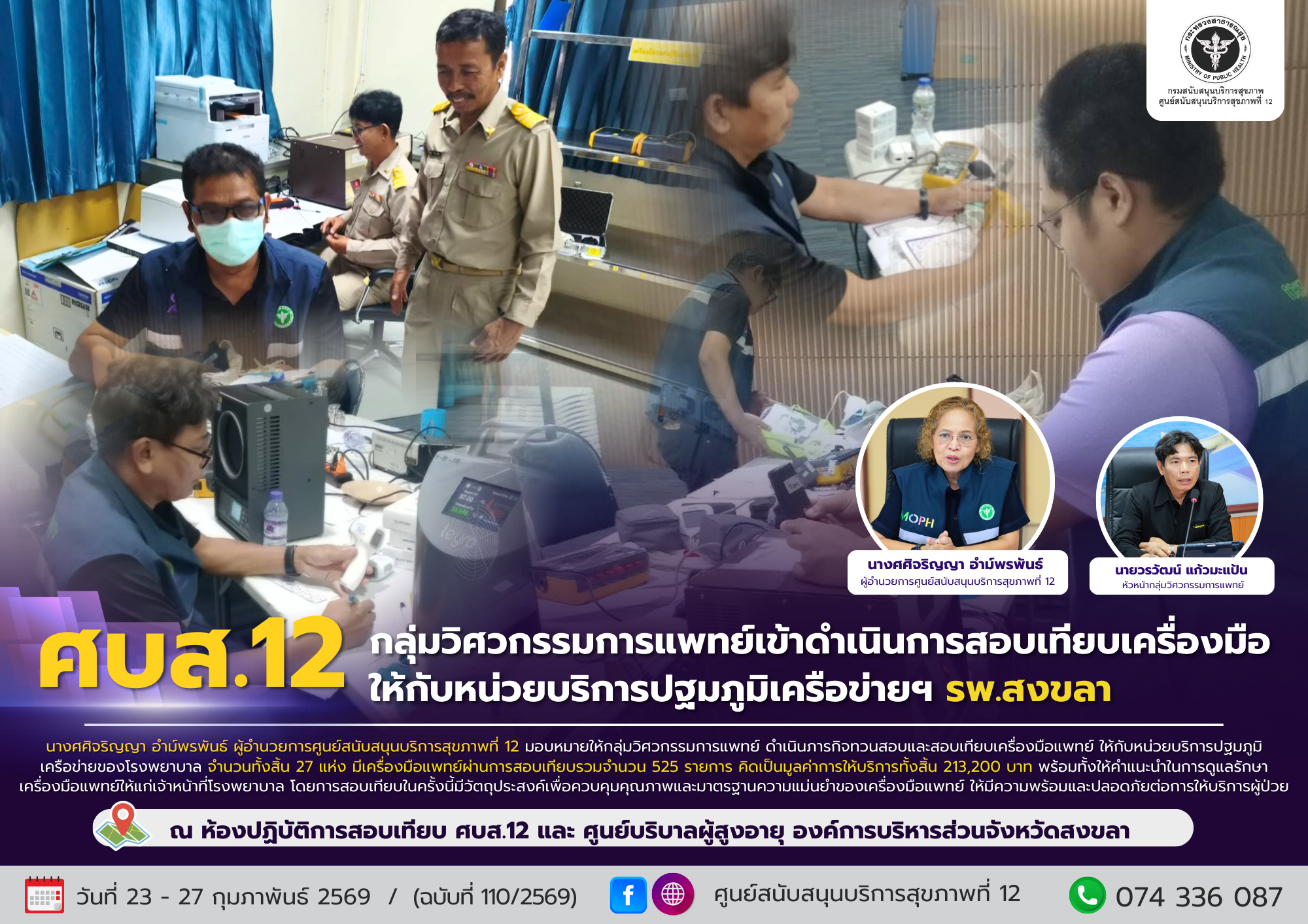 ระหว่างวันที่ 23 – 27 กุมภาพันธ์ 2569 นางศศิจริญญา อำม์พรพันธ์ ผู้อำนวยการศูนย์สนับสนุนบริการสุขภาพที่ 12 มอบหมายให้กลุ่มวิศวกรรมการแพทย์ ดำเนินภารกิจทวนสอบและสอบเทียบเครื่องมือแพทย์ ให้กับหน่วยบริการปฐมภูมิ เครือข่ายของโรงพยาบาล จำนวนทั้งสิ้น 27 แห่ง มีเครื่องมือแพทย์ผ่านการสอบเทียบรวมจำนวน 525 รายการ คิดเป็นมูลค่าการให้บริการทั้งสิ้น 213,200 บาท พร้อมทั้งให้คำแนะนำในการดูแลรักษาเครื่องมือแพทย์ให้แก่เจ้าหน้าที่โรงพยาบาล โดยการสอบเทียบในครั้งนี้มีวัตถุประสงค์เพื่อควบคุมคุณภาพและมาตรฐานความแม่นยำของเครื่องมือแพทย์ ให้มีความพร้อมและปลอดภัยต่อการให้บริการผู้ป่วย