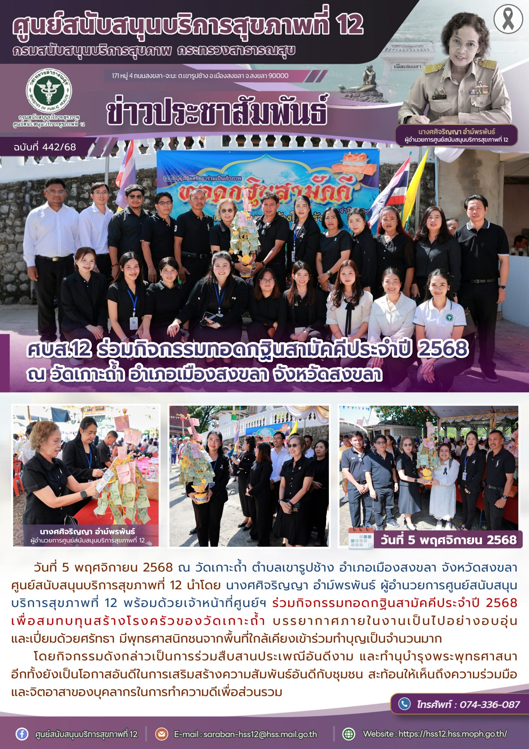 วันที่ 5 พฤศจิกายน 2568 ณ วัดเกาะถ้ำ ตำบลเขารูปช้าง อำเภอเมืองสงขลา จังหวัดสงขลา ศูนย์สนับสนุนบริการสุขภาพที่ 12 นำโดย นางศศิจริญญา อำม์พรพันธ์ ผู้อำนวยการศูนย์สนับสนุนบริการสุขภาพที่ 12 พร้อมด้วยเจ้าหน้าที่ศูนย์ฯ ร่วมกิจกรรมทอดกฐินสามัคคีประจำปี 2568 เพื่อสมทบทุนสร้างโรงครัวของวัดเกาะถ้ำ บรรยากาศภายในงานเป็นไปอย่างอบอุ่น และเปี่ยมด้วยศรัทธา มีพุทธศาสนิกชนจากพื้นที่ใกล้เคียงเข้าร่วมทำบุญเป็นจำนวนมาก