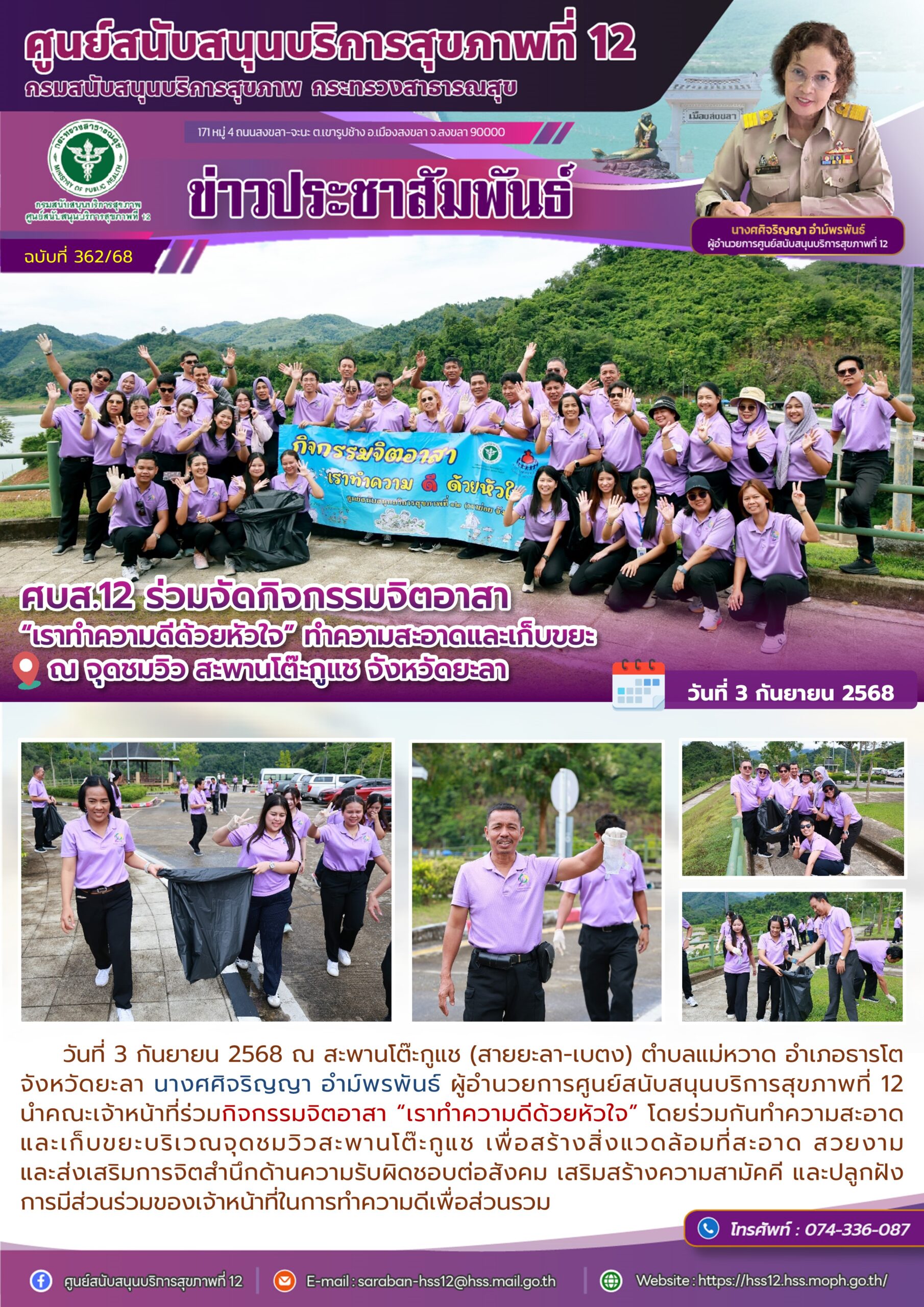 ศบส.12 ร่วมจัดกิจกรรมจิตอาสา “เราทำความดีด้วยหัวใจ” ทำความสะอาดและเก็บขยะ ณ จุดชมวิว สะพานโต๊ะกูแช จังหวัดยะลา