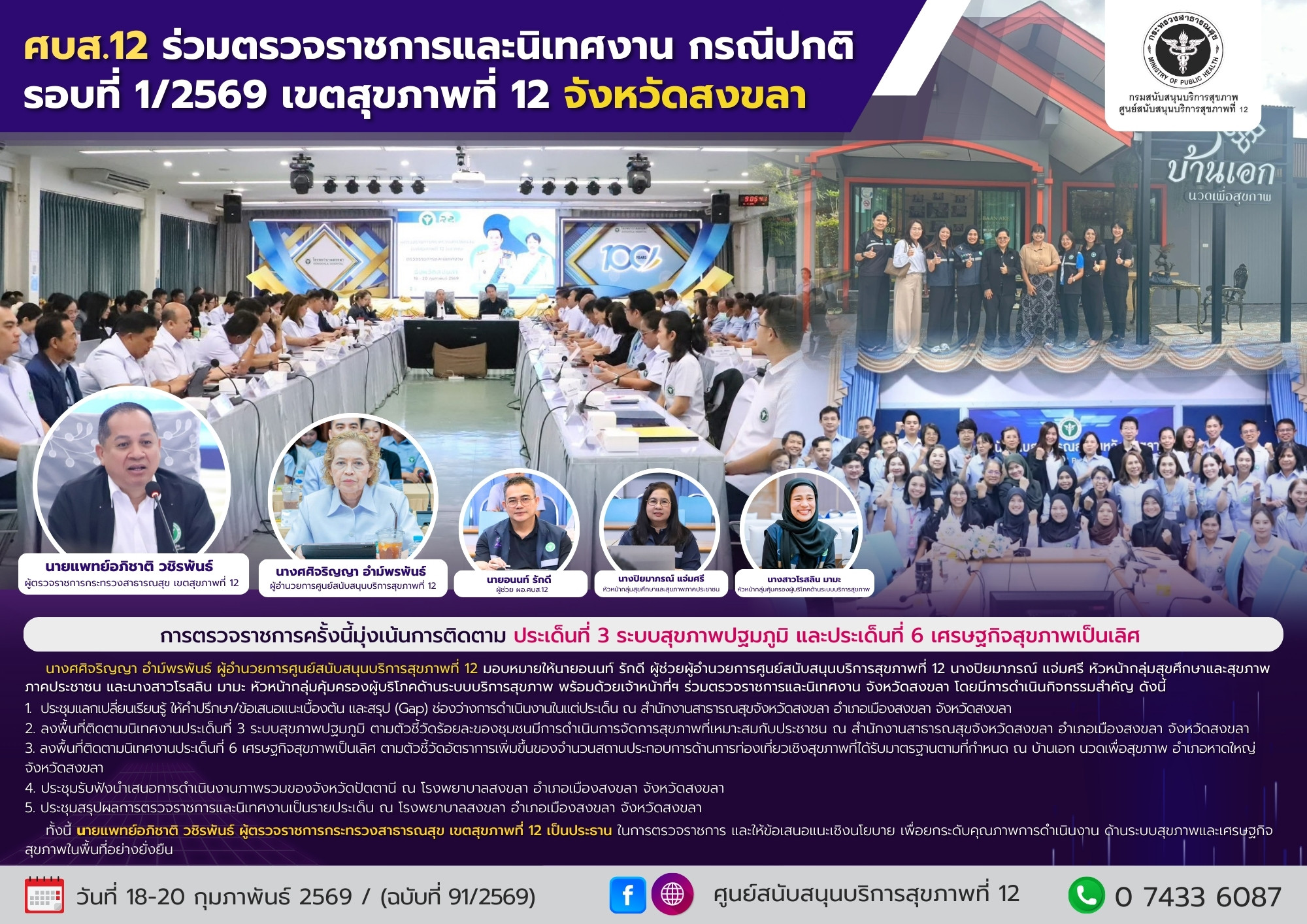 ระหว่างวันที่ 18-20 กุมภาพันธ์ 2569 นางศศิจริญญา อำม์พรพันธ์ ผู้อำนวยการศูนย์สนับสนุนบริการสุขภาพที่ 12 มอบหมายให้นายอนนท์ รักดี ผู้ช่วยผู้อำนวยการศูนย์สนับสนุนบริการสุขภาพที่ 12 นางปิยมาภรณ์ แจ่มศรี หัวหน้ากลุ่มสุขศึกษาและสุขภาพภาคประชาชน และนางสาวโรสลิน มามะ หัวหน้ากลุ่มคุ้มครองผู้บริโภคด้านระบบบริการสุขภาพ พร้อมด้วยเจ้าหน้าที่ฯ ร่วมตรวจราชการและนิเทศงาน กรณีปกติ รอบที่ 1/2569 เขตสุขภาพที่ 12 จังหวัดสงขลา โดยมุ่งเน้นการติดตามประเด็นที่ 3 ระบบสุขภาพปฐมภูมิ และประเด็นที่ 6 เศรษฐกิจสุขภาพเป็นเลิศ โดยมีการดำเนินกิจกรรมสำคัญ ดังนี้
