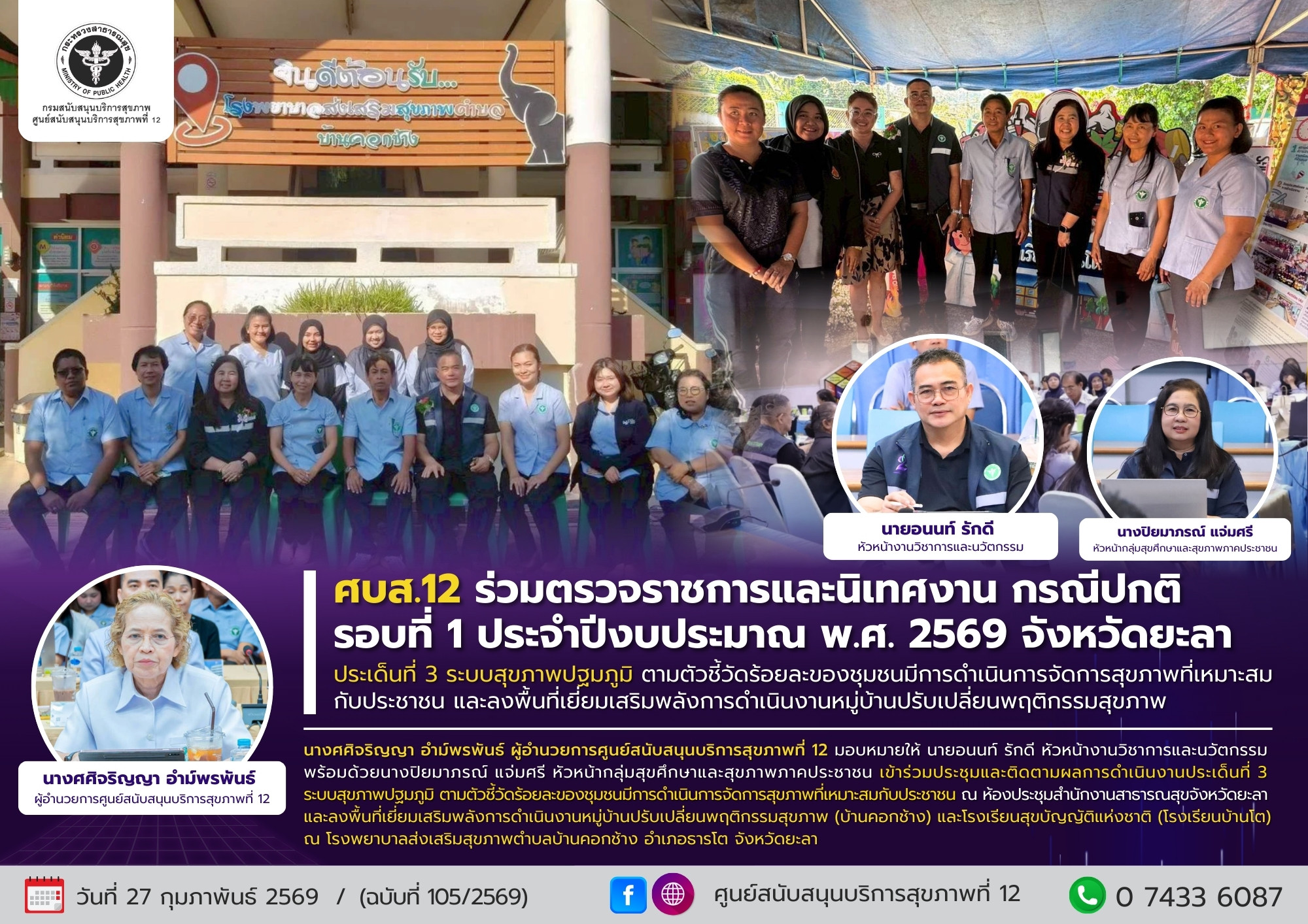 วันที่ 27 กุมภาพันธ์ 2569 นางศศิจริญญา อำม์พรพันธ์ ผู้อำนวยการศูนย์สนับสนุนบริการสุขภาพที่ 12 มอบหมายให้ นายอนนท์ รักดี หัวหน้างานวิชาการและนวัตกรรม พร้อมด้วยนางปิยมาภรณ์ แจ่มศรี หัวหน้ากลุ่มสุขศึกษาและสุขภาพภาคประชาชน เข้าร่วมประชุมและติดตามผลการดำเนินงานประเด็นที่ 3 ระบบสุขภาพปฐมภูมิ ตามตัวชี้วัดร้อยละของชุมชนมีการดำเนินการจัดการสุขภาพที่เหมาะสมกับประชาชน ณ ห้องประชุมสำนักงานสาธารณสุขจังหวัดยะลา และลงพื้นที่เยี่ยมเสริมพลังการดำเนินงานหมู่บ้านปรับเปลี่ยนพฤติกรรมสุขภาพ (บ้านคอกช้าง) และโรงเรียนสุขบัญญัติแห่งชาติ (โรงเรียนบ้านโต) ณ โรงพยาบาลส่งเสริมสุขภาพตำบลบ้านคอกช้าง อำเภอธารโต จังหวัดยะลา