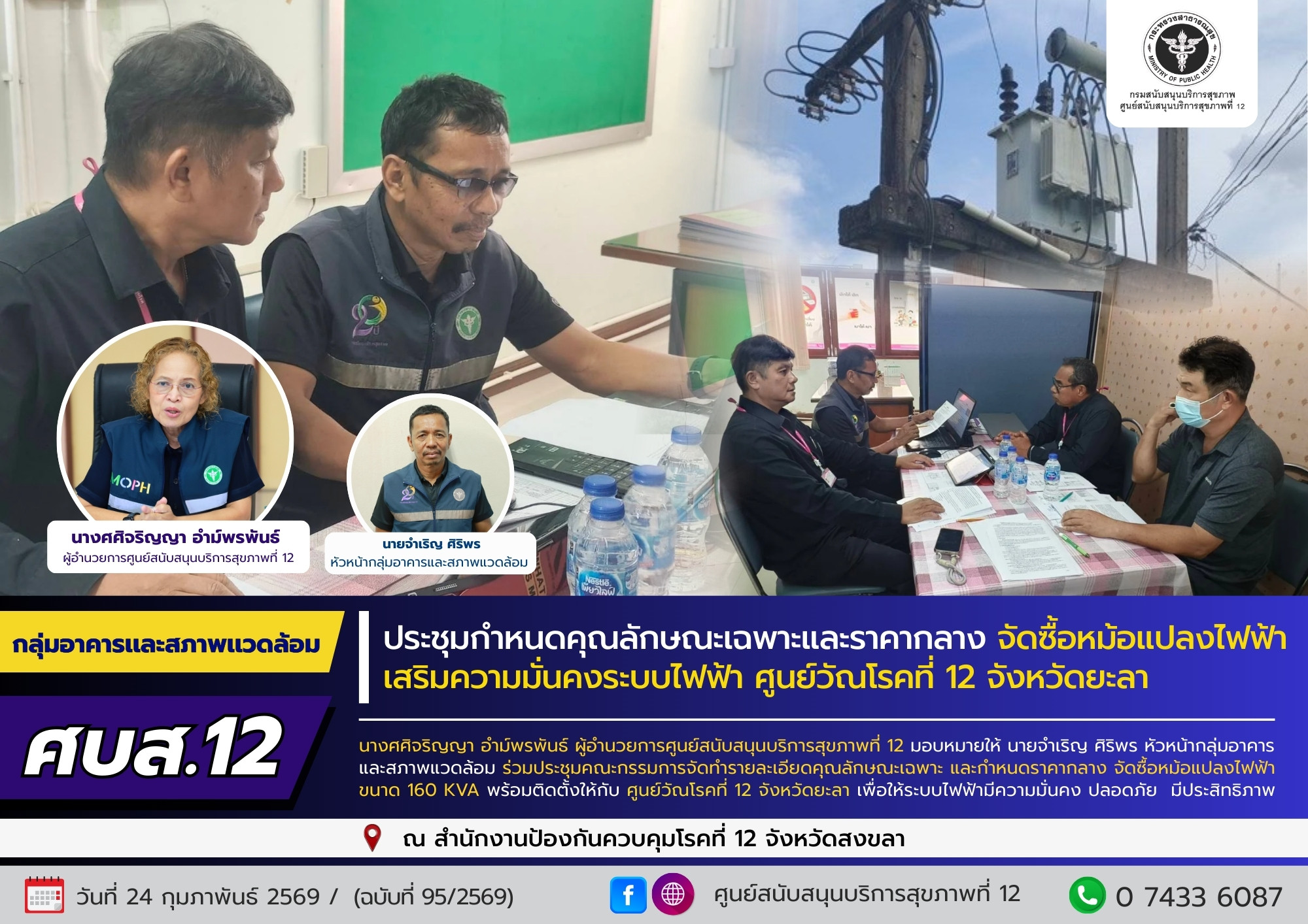 วันที่ 24 กุมภาพันธ์ 2569 นางศศิจริญญา อำม์พรพันธ์ ผู้อำนวยการศูนย์สนับสนุนบริการสุขภาพที่ 12 มอบหมายให้ นายจำเริญ ศิริพร หัวหน้ากลุ่มอาคารและสภาพแวดล้อม เข้าร่วมประชุมคณะกรรมการจัดทำรายละเอียดคุณลักษณะเฉพาะ (TOR) และกำหนดราคากลางในการจัดซื้อหม้อแปลงไฟฟ้า ขนาด 160 KVA พร้อมติดตั้ง สำหรับศูนย์วัณโรคที่ 12 จังหวัดยะลา เพื่อให้ระบบไฟฟ้ามีความมั่นคง ปลอดภัย มีประสิทธิภาพ