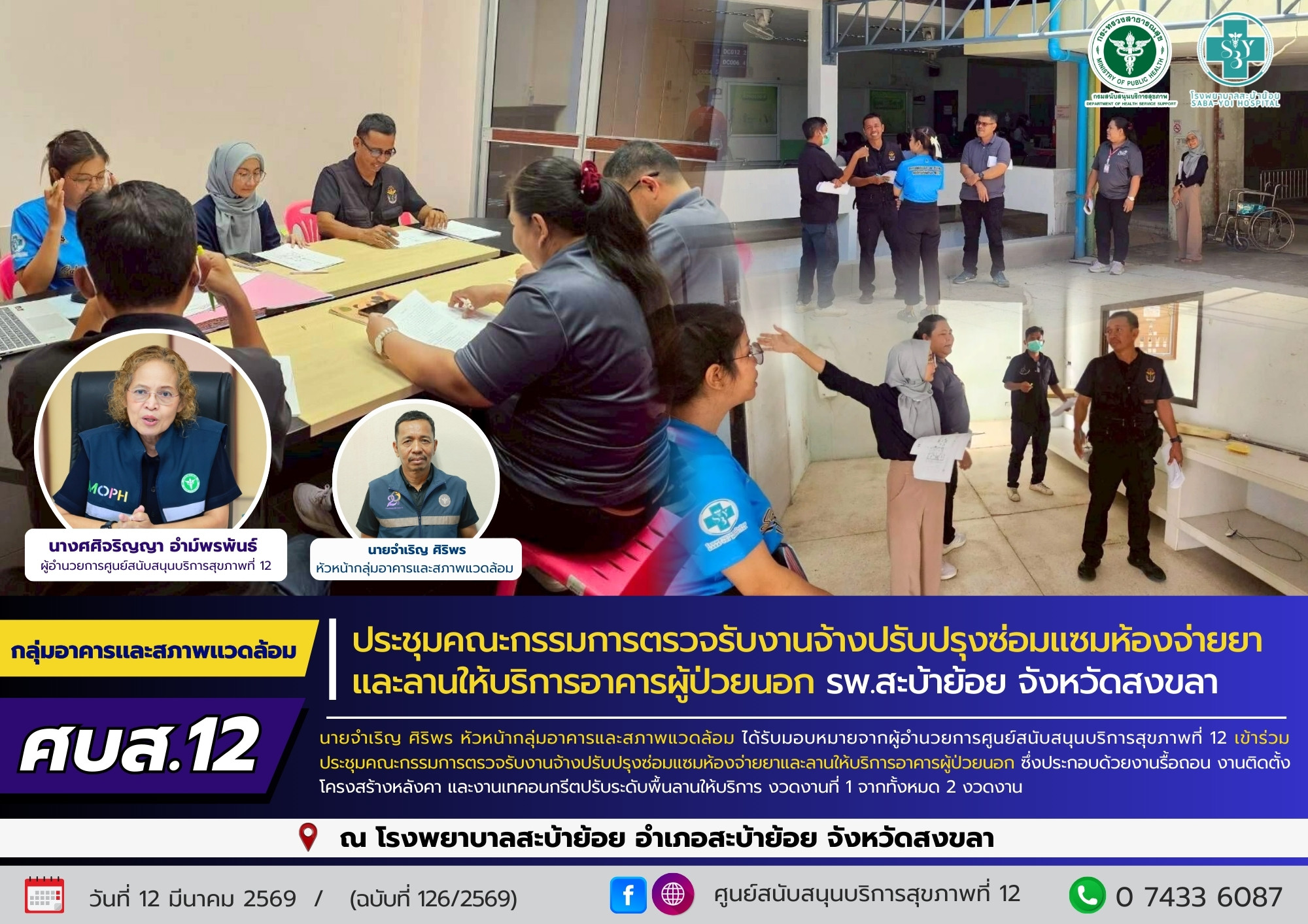 วันที่ 12 มีนาคม 2569 นายจำเริญ ศิริพร หัวหน้ากลุ่มอาคารและสภาพแวดล้อม ได้รับมอบหมายจากผู้อำนวยการศูนย์สนับสนุนบริการสุขภาพที่ 12 เข้าร่วมประชุมคณะกรรมการตรวจรับงานจ้างปรับปรุงซ่อมแซมห้องจ่ายยาและลานให้บริการอาคารผู้ป่วยนอก ซึ่งประกอบด้วยงานรื้อถอน งานติดตั้งโครงสร้างหลังคา และงานเทคอนกรีตปรับระดับพื้นลานให้บริการ งวดที่ 1 จากทั้งหมด 2 งวด ณ โรงพยาบาลสะบ้าย้อย อำเภอสะบ้าย้อย จังหวัดสงขลา