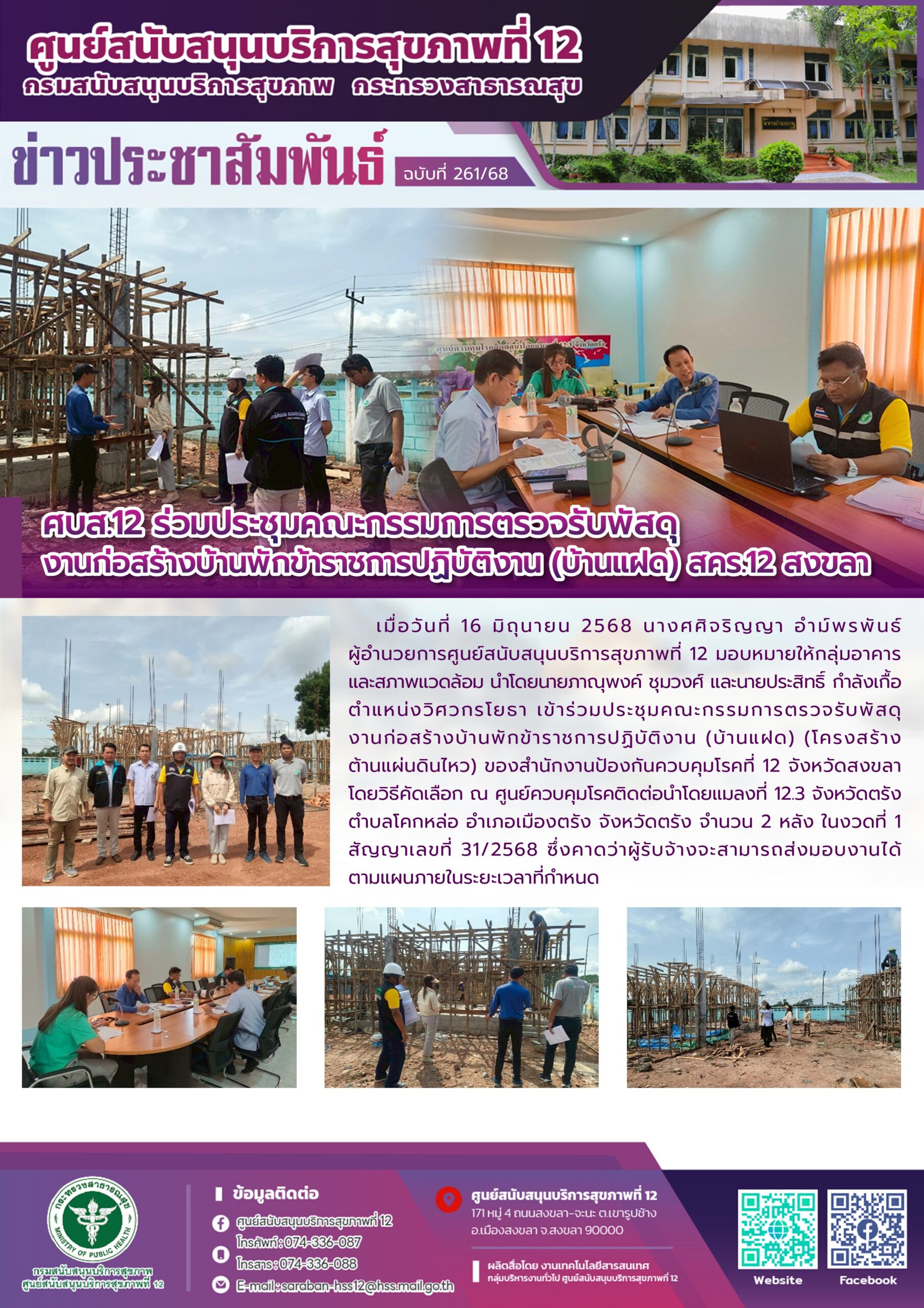 เมื่อวันที่ 16 มิถุนายน 2568 นางศศิจริญญา อำม์พรพันธ์ ผู้อำนวยการศูนย์สนับสนุนบริการสุขภาพที่ 12 มอบหมายให้กลุ่มอาคารและสภาพแวดล้อม นำโดยนายภาณุพงค์ ชุมวงศ์ และนายประสิทธิ์ กำลังเกื้อ ตำแหน่งวิศวกรโยธา เข้าร่วมประชุมคณะกรรมการตรวจรับพัสดุงานก่อสร้างบ้านพักข้าราชการปฏิบัติงาน (บ้านแฝด) (โครงสร้างต้านแผ่นดินไหว) ของสำนักงานป้องกันควบคุมโรคที่ 12 จังหวัดสงขลา โดยวิธีคัดเลือก ณ ศูนย์ควบคุมโรคติดต่อนำโดยแมลงที่ 12.3 จังหวัดตรัง ตำบลโคกหล่อ อำเภอเมืองตรัง จังหวัดตรัง จำนวน 2 หลัง ในงวดที่ 1 สัญญาเลขที่ 31/2568 ซึ่งคาดว่าผู้รับจ้างจะสามารถส่งมอบงานได้ ตามแผนภายในระยะเวลาที่กำหนด
